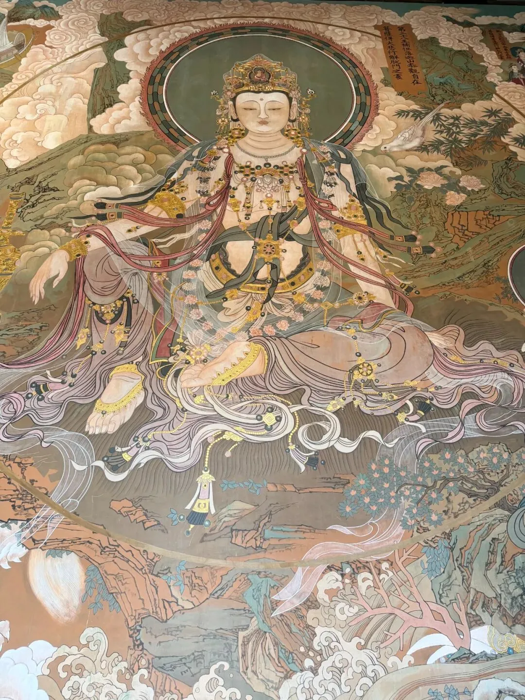 壁画人物祥和庄严,线条优美流畅,层次鲜明,填色用的是传统矿物质颜料,颜色特别美。