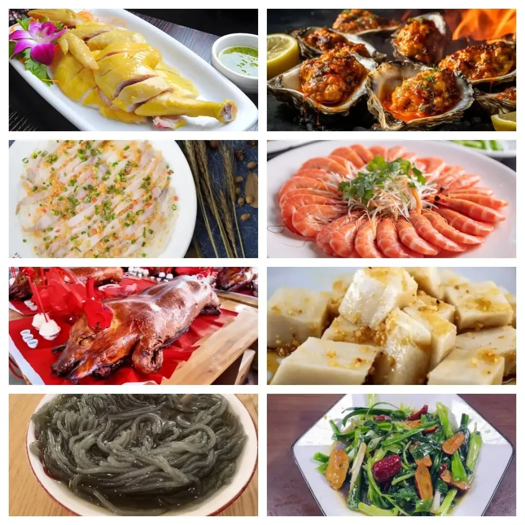 品湛江特色渔家菜:湛江白切鸡、炭烧生蚝、蒜蓉粉丝蒸沙虫、白灼明虾、麻章烧猪、簸箕炊、薯粉索、腌生蒜/葱等,时令蔬菜按季节更换。