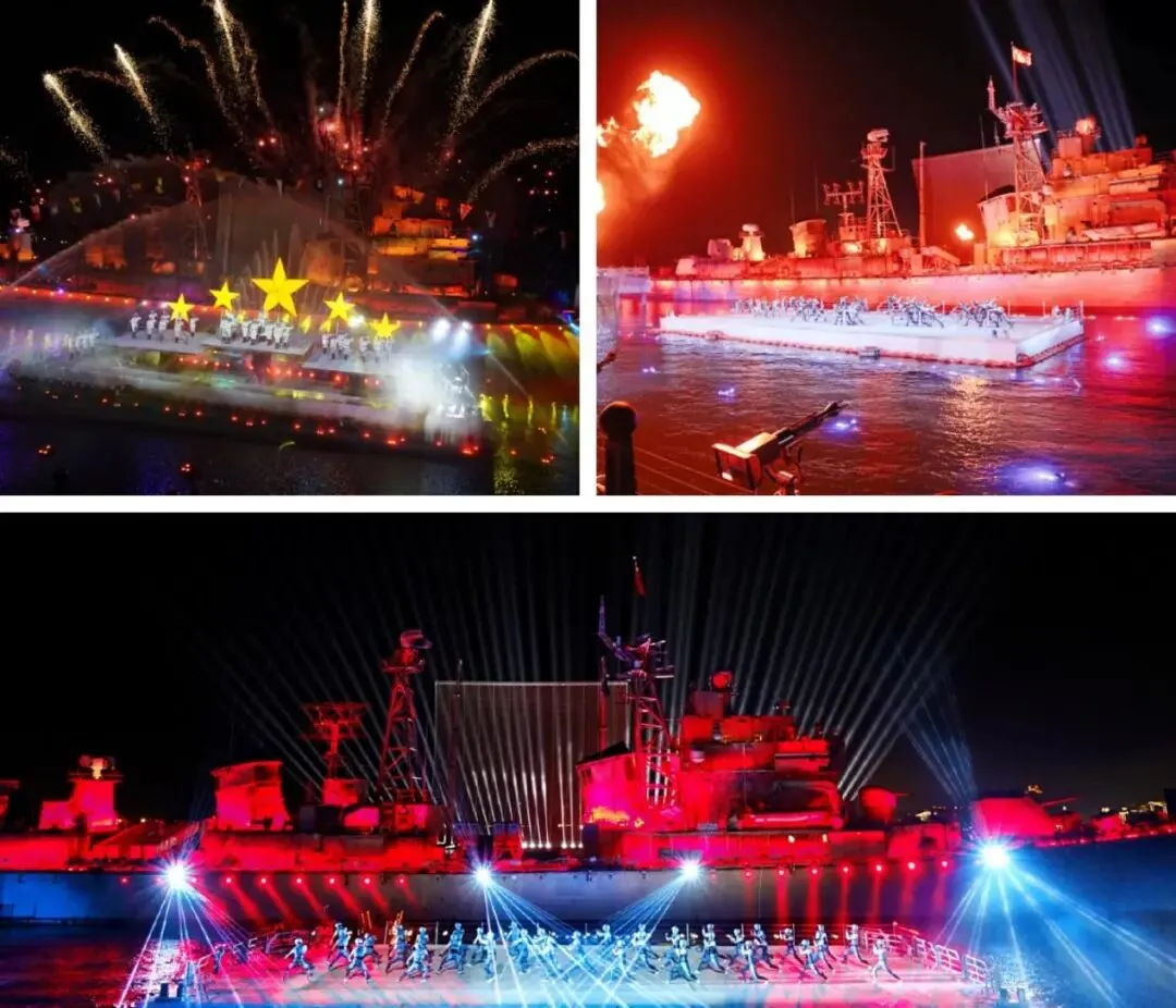 夜幕降临,赴湛江军博园观看中国首部退役军舰海上实景演艺《军港之夜》 ,演出以退役“湛江舰”为舞台,分五大篇章,融合音乐舞蹈与高科技声光电,场面恢宏感人。
