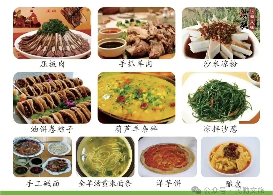 碱面茄辣烩、麦索、洋芋饼、沙米凉粉、黄米稠饭、薄荷(锁阳)油饼、糖油糕、胡麻盐卷卷、结子馍馍、油饼卷糕、凉拌沙葱