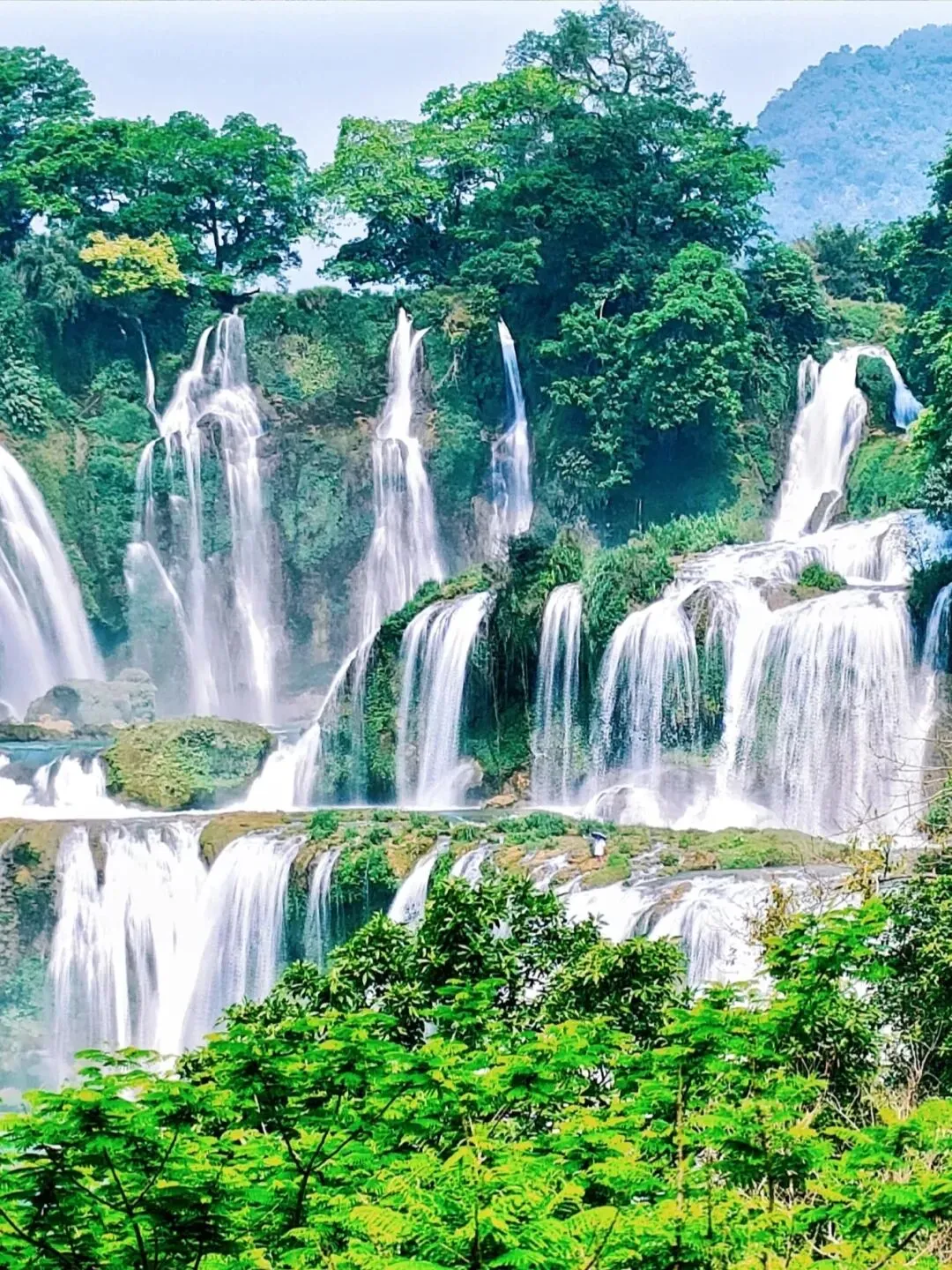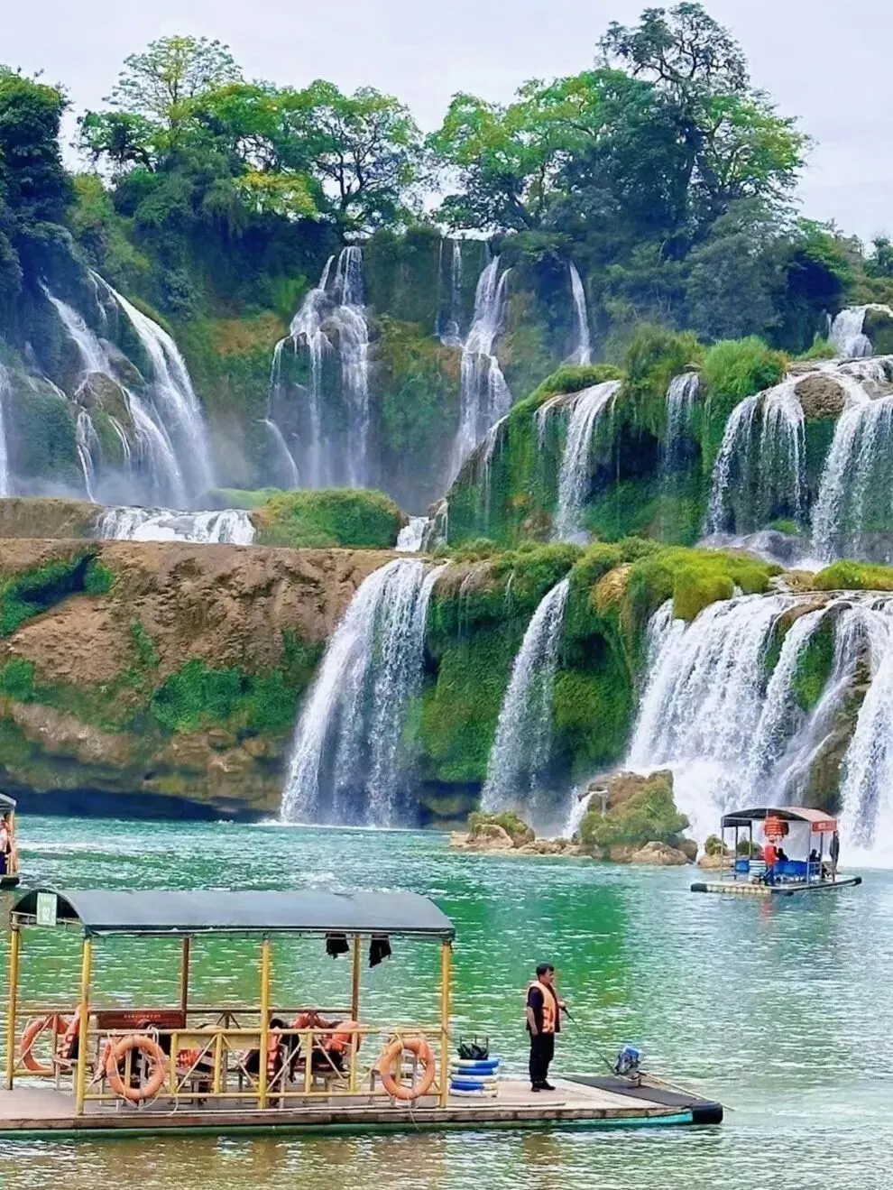 1️⃣德天跨国瀑布:横跨中越两国,丰水期气势磅礴,坐竹筏能直接划到瀑布底下,水雾扑面超震撼