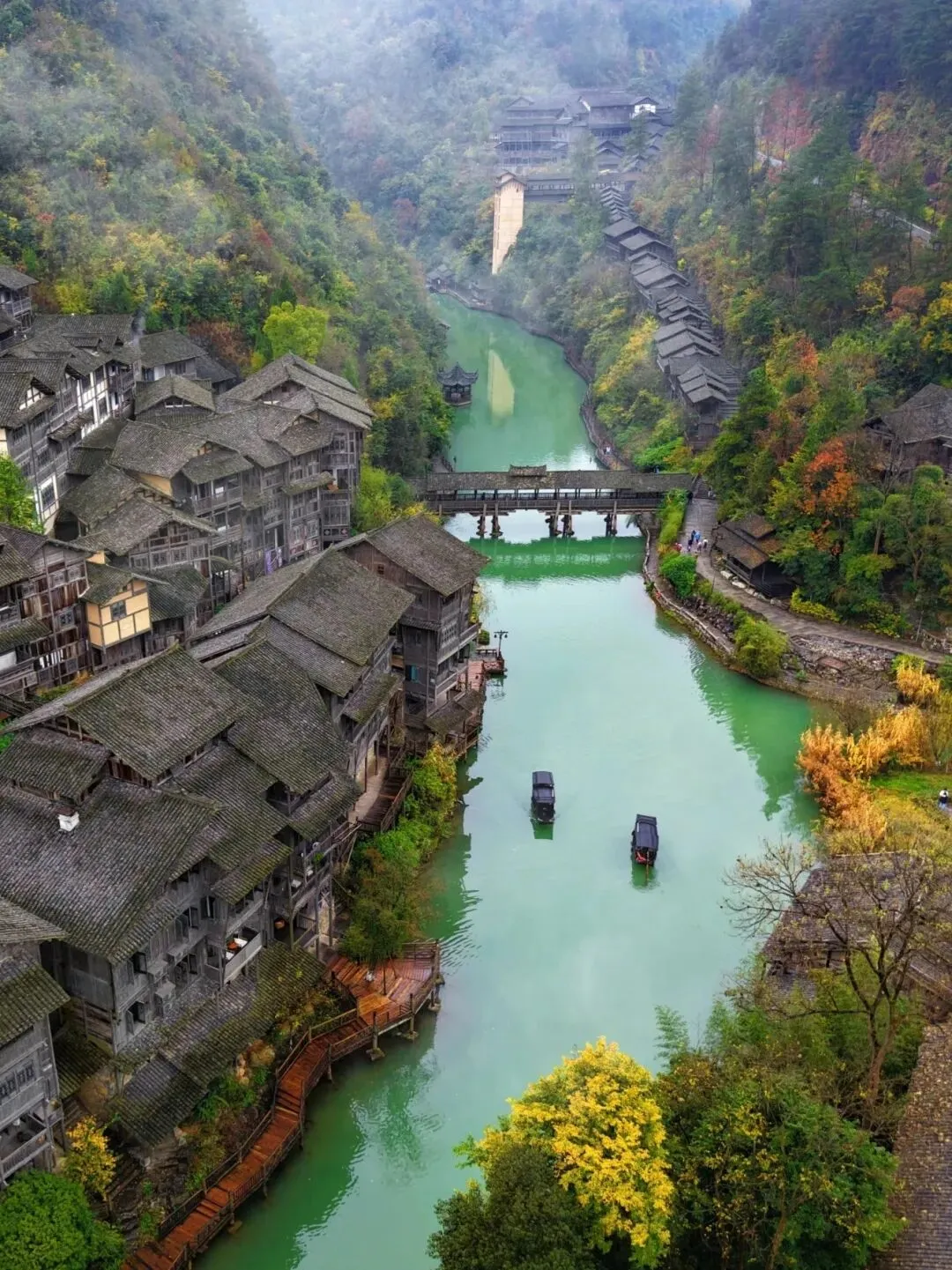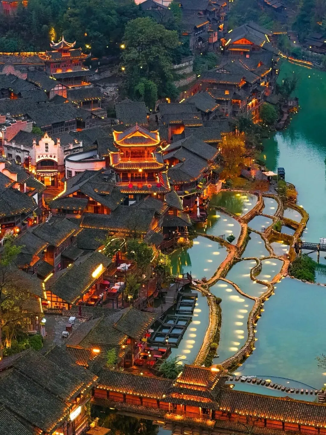 🌟【核心特色】临江吊脚楼,夜景还有无人机灯光秀,白天摇橹船游江,晚上看灯火表演,超级幸福
