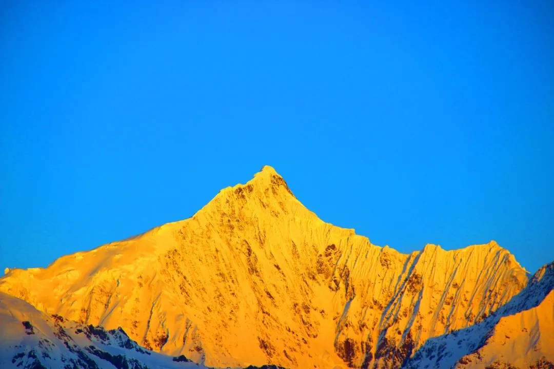 藏区八大神山之首,主峰卡瓦格博海拔6740米。当清晨第一缕阳光点亮雪峰,万丈金光照耀雪山之巅——这就是令人窒息的"日照金山"奇观。