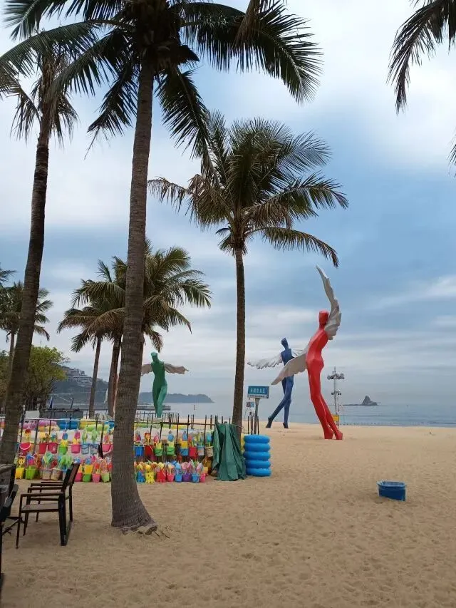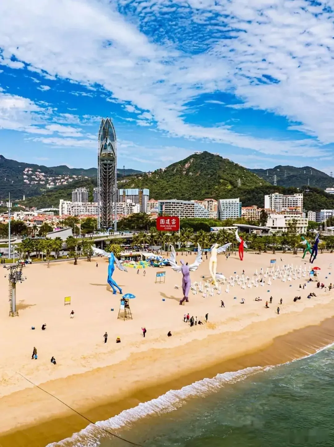 🔶自驾(周末慎选!) 可以导航至“大梅沙海滨公园停车场”,但说实话,大梅沙的停车位非常紧张,旺季周末更是一位难求。 而且在每年五一至十一期间的周末及节假日,盐田梅沙片区实施车辆预约通行政策,需要提前在“深圳交警”公众号预约才能进入。 停車省钱小技巧:如果自驾前往,建议把车停到附近的奥特莱斯购物村停车场,步行到大梅沙大约10分钟,购物消费满一定金额还可以减免停车费,一举两得。 🔶打车 从深圳北站或福田站打车到大梅沙约45分钟,费用大概80—100元;从宝安机场出发约1小时左右。 04 必打卡景点&拍照机位·拍照党速速收藏 🔶太阳广场 & 月亮广场 太阳广场是公园的核心地标,占地约1.3万平方米,是大梅沙最具辨识度的区域。 太阳广场和月亮广场之间有432米长的阳光走廊相连,两侧椰林树影,满满亚热带风情。这里也是大家集合碰头的首选地点。 🔶愿望塔& 鸟人雕塑 大梅沙最具标志性的打卡景观,在沙滩上一眼就能看到。愿望塔可以登塔观景,俯瞰整个大鹏湾的壮丽海景,登塔门票约39元。 塔下的鸟人雕塑也是出片宝藏地,随手一拍都很有艺术感。