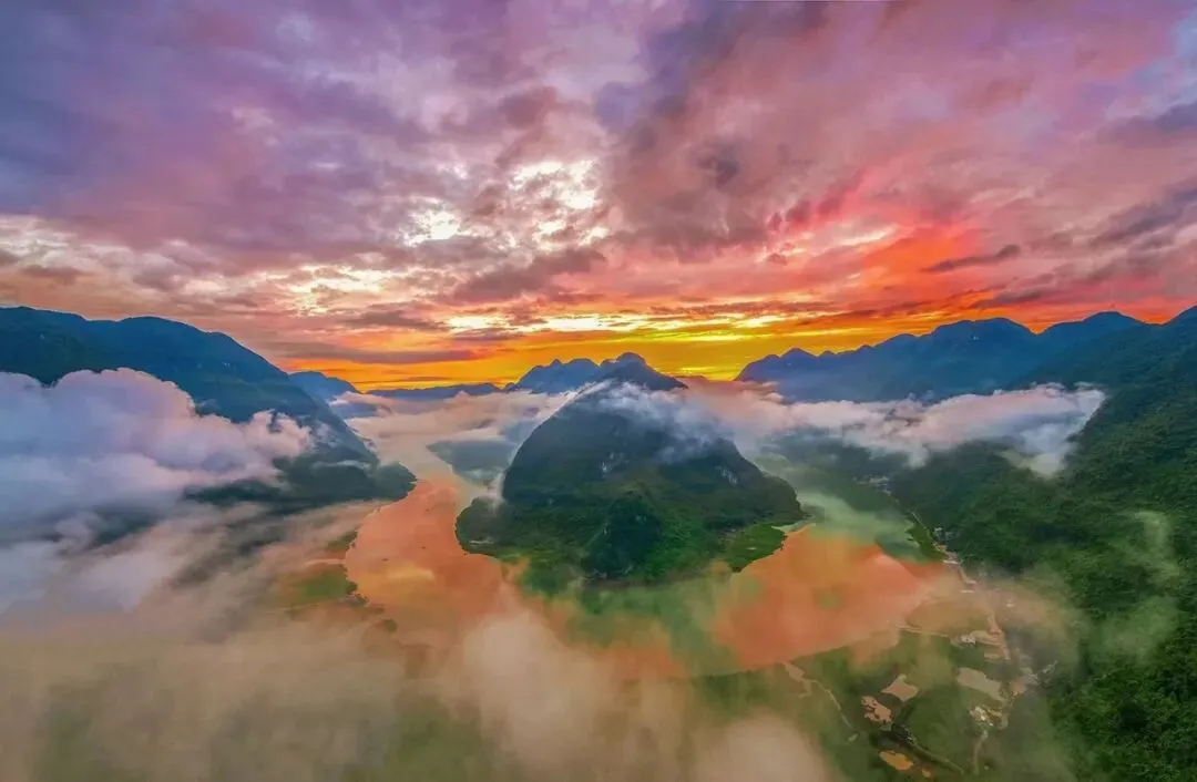 红水河第一湾:270°翡翠江湾环抱峰林,日落绝美无滤镜,观景视野开阔,随手拍出治愈山野大片,是东兰标志性自然景观。