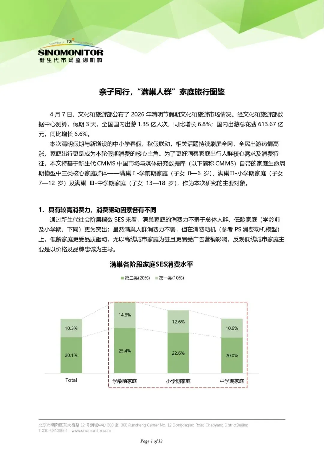 2026年清明节假期,全国国内出游人数达1.35亿人次,同比增长6.8%,出游总花费613.67亿元,同比增长6.6%。此次假期与新增的中小学春假、秋假相呼应,家庭出行成为消费核心。本文基于CMMS家庭生命周期模型,对满巢I(学前期)、满巢II(小学期)、满巢III(中学期)三类家庭进行分析,揭示其旅行消费特征、休闲偏好、出行方式及信息获取习惯。