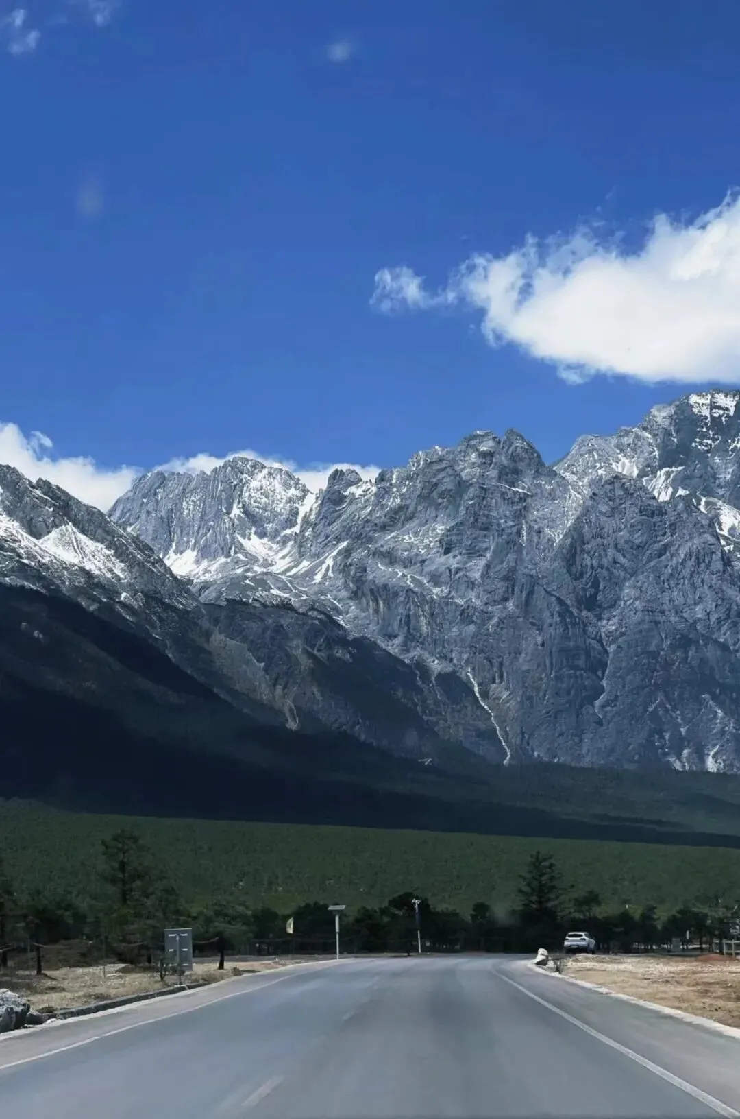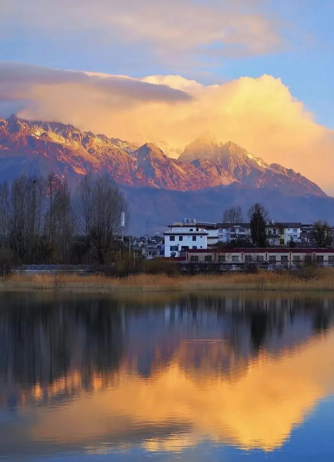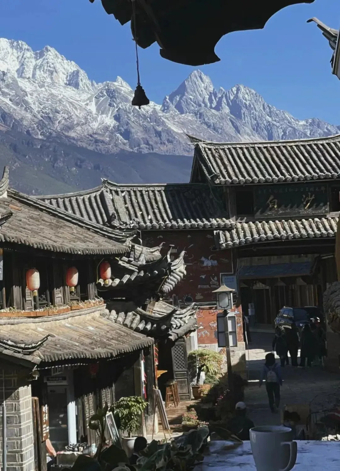 雪山机位:如果你11月份到来年的三四月份过来,这是你的第一个雪山机位。就是大水车旁边的巷子,走进去,然后转身,就看雪山了。