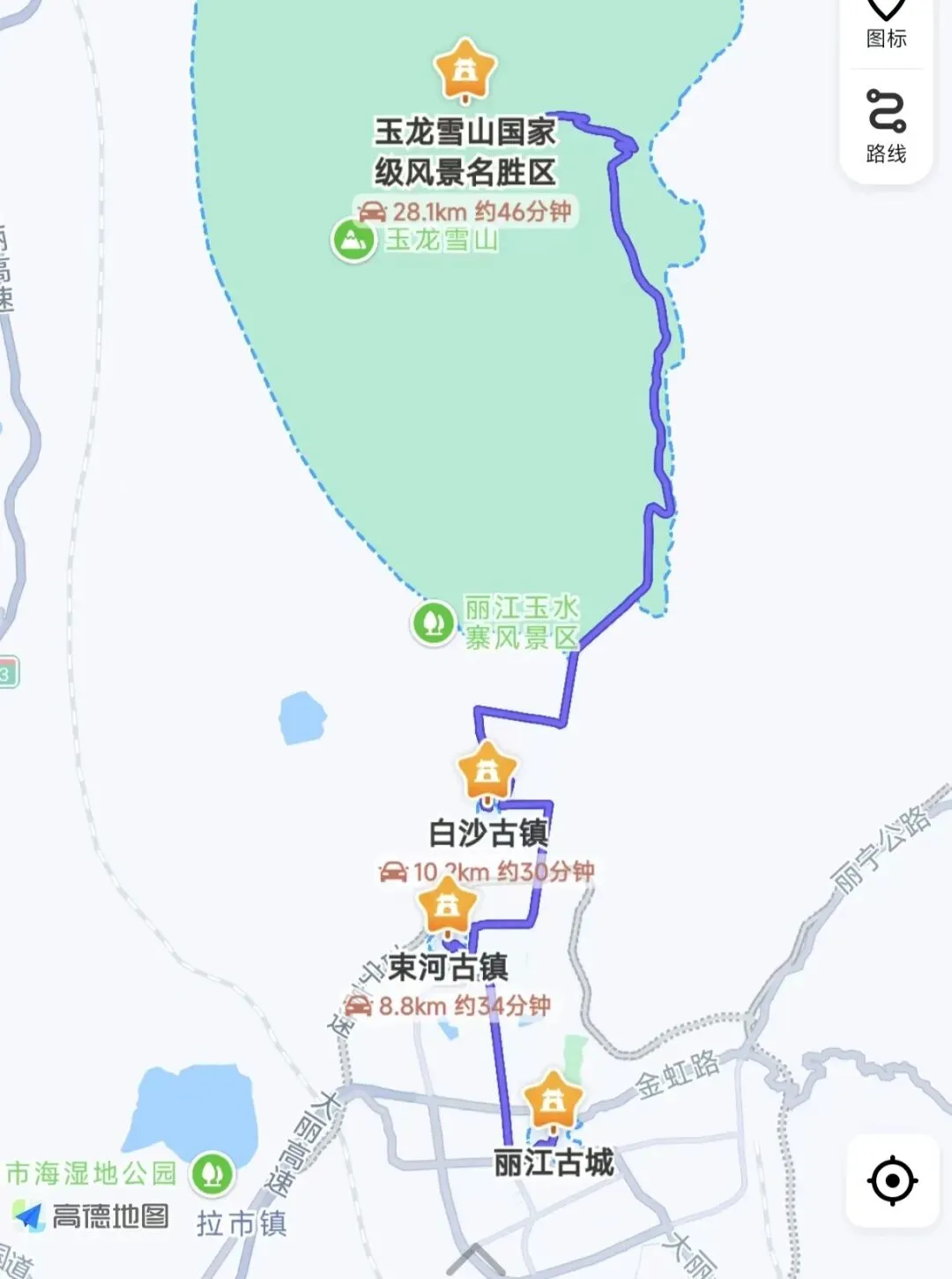 大研到束河是五公里,打车大概10多点,到白沙是10公里,滴滴大概20多点,彼此之间都有公交车。