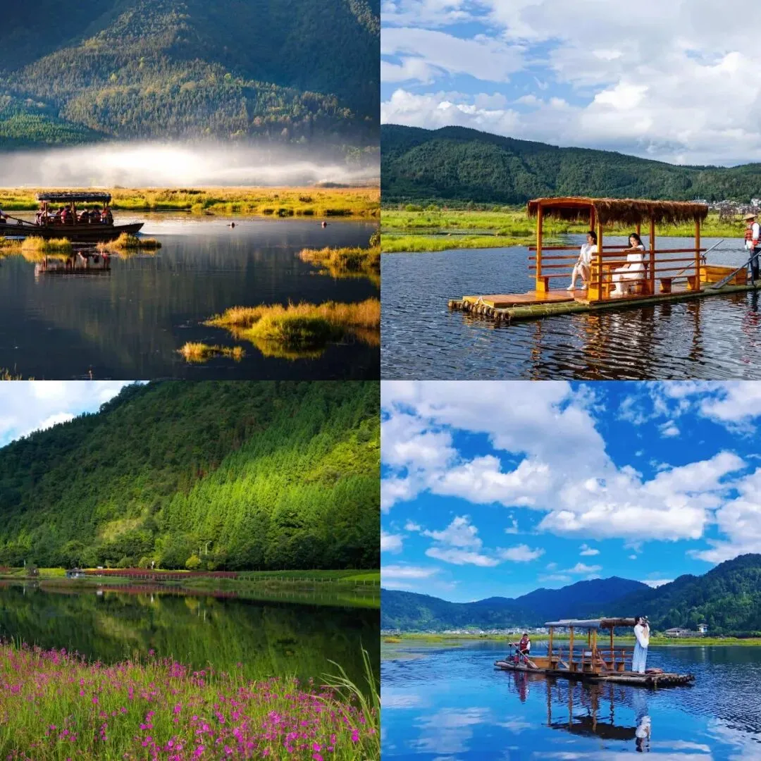 全国唯一火山堰塞湖浮毯型湿地,草甸漂在水上,可划草排、竹筏,秋冬看候鸟 。