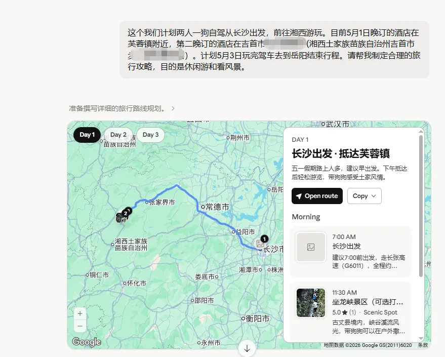 先要框架,再要细节。一次性问太多,容易得到一个「什么都有但什么都不精」的结果。建议先让它出整体框架,确认方向对了,再追问某一天的细节、某个景点的玩法、某段路的路况。