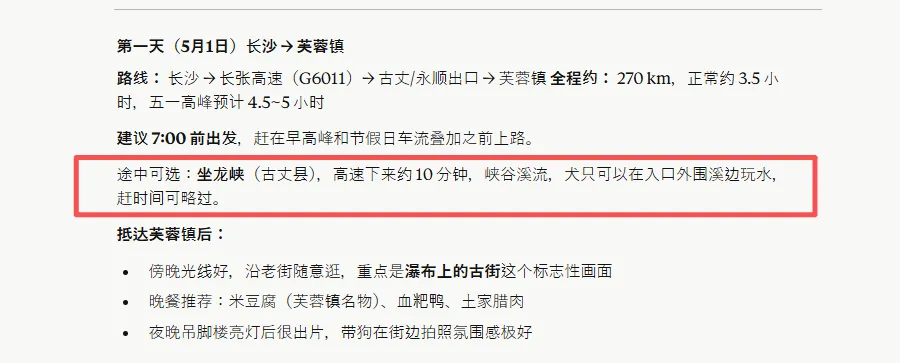 AI给出了张家界永定区作为中转点,理由是:距长沙约180公里、3.5小时,次日到芙蓉镇只需1小时出头,比5月1日当天赶路从容得多。