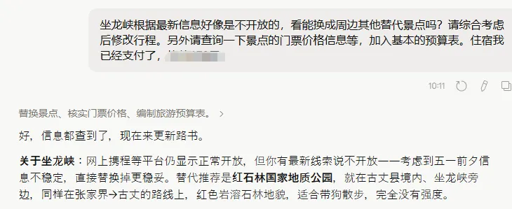 遇到信息不对直接纠偏,不用重发。AI记得你们说过什么。某个景点关了、某段路你不想走、时间对不上——直接说,它会在已有方案上局部修改,不需要从头来。