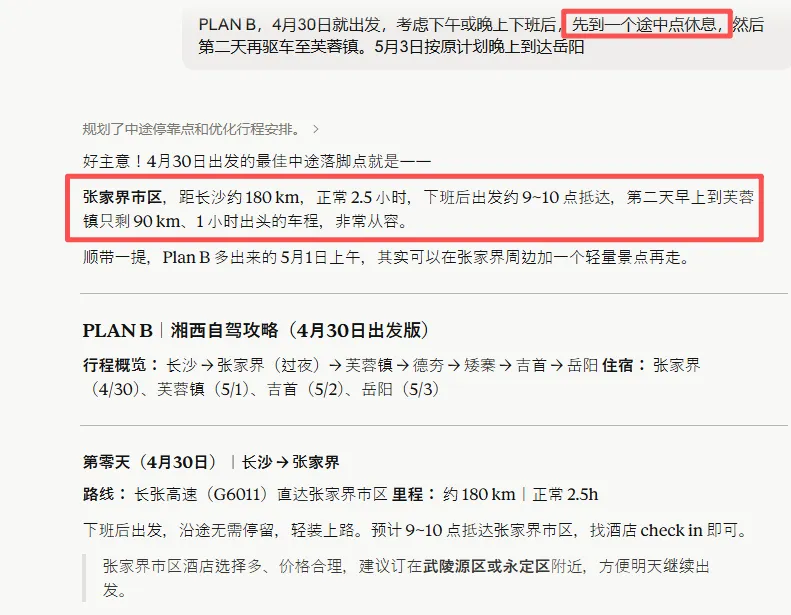 原来的计划是5月1日当天从长沙出发。我随口问了一句:「如果4月30日提前出发,在中途落脚一晚,怎么安排比较好?」