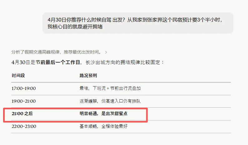 然后它顺带解决了一个我没想到要问的问题——五一出城的拥堵。它主动分析了4月30日各个时间段的路况,建议21:00之后出发,并解释了为什么16:00出发是「全天最难受的时间段之一」。