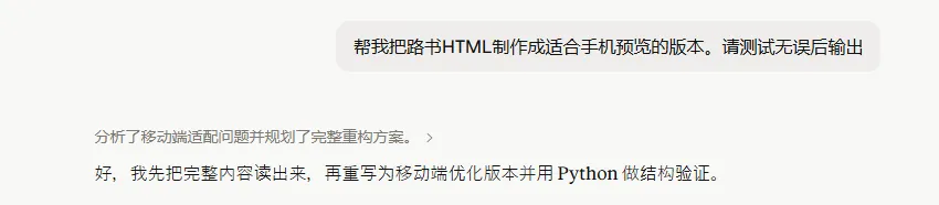 如果你想要一个可以存在手机里随时翻的版本,直接跟它说。比如「把这个行程做成适合手机阅读的PDF」,或者「做成一个可以在手机浏览器打开的网页版路书」。格式这件事不用自己动手,告诉它你想要什么样的,它来做。