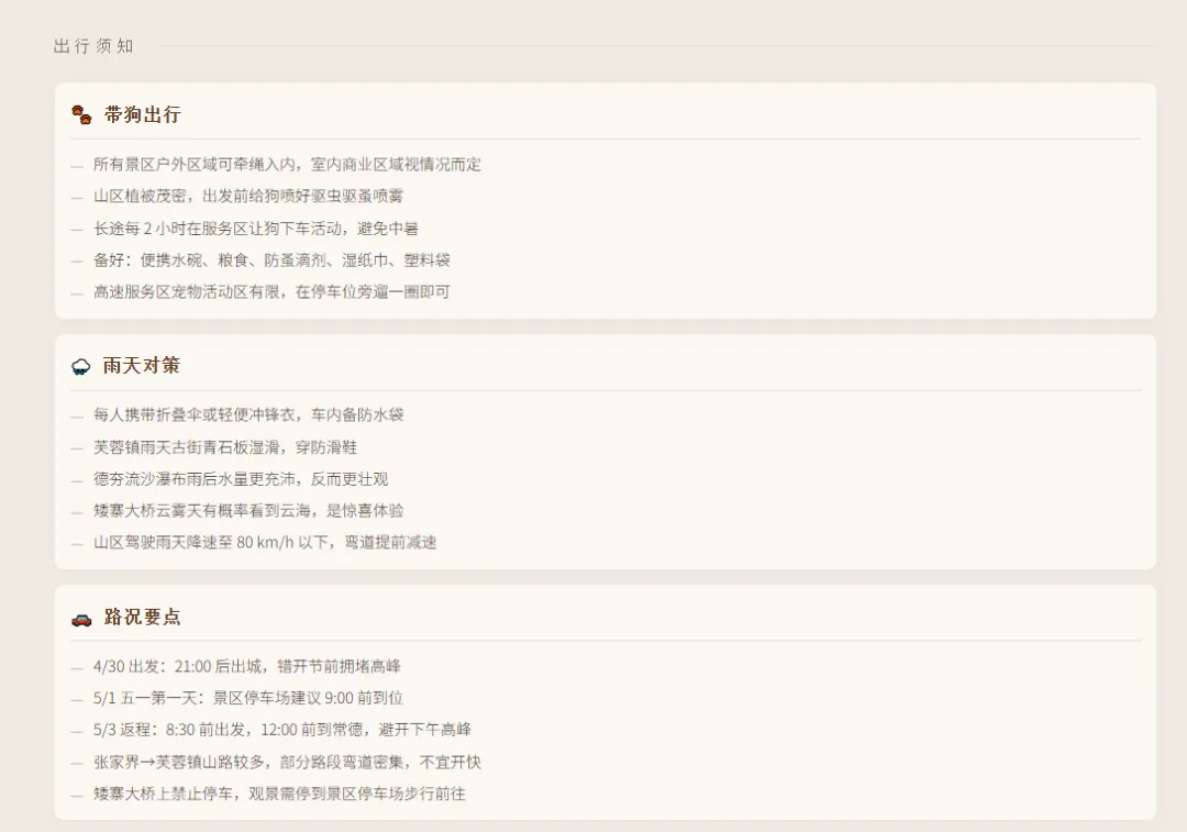 AI给出的第一版方案,已经考虑到了带狗的限制——哪些景区户外可以牵绳进,哪里更适合狗狗玩水,哪段路人流太大建议绕开。这些是我自己查攻略很难系统整理出来的信息。
