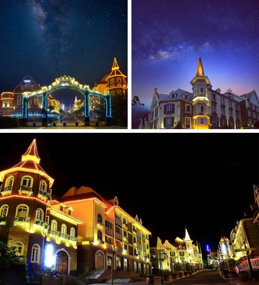 用餐后驱车至白鹿小镇。红顶白墙的法式建筑在灯火中璀璨迷人,街巷回荡音乐,可漫步青石板路,邂逅浪漫光影。
