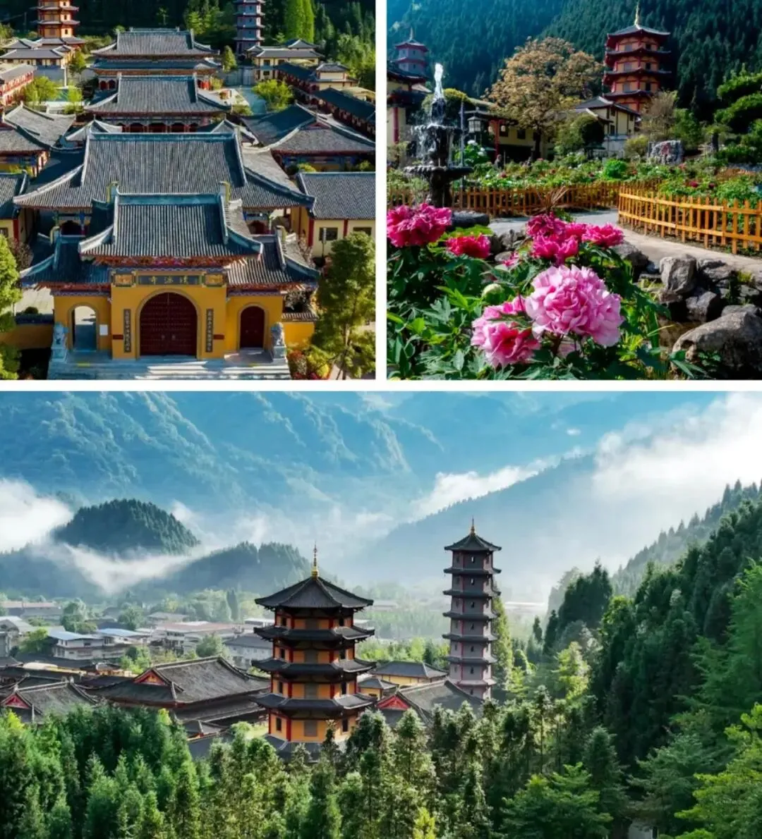 清晨前往九峰山,行至山麓清凉寺,远眺金顶云雾缭绕,4月中牡丹开得正艳。