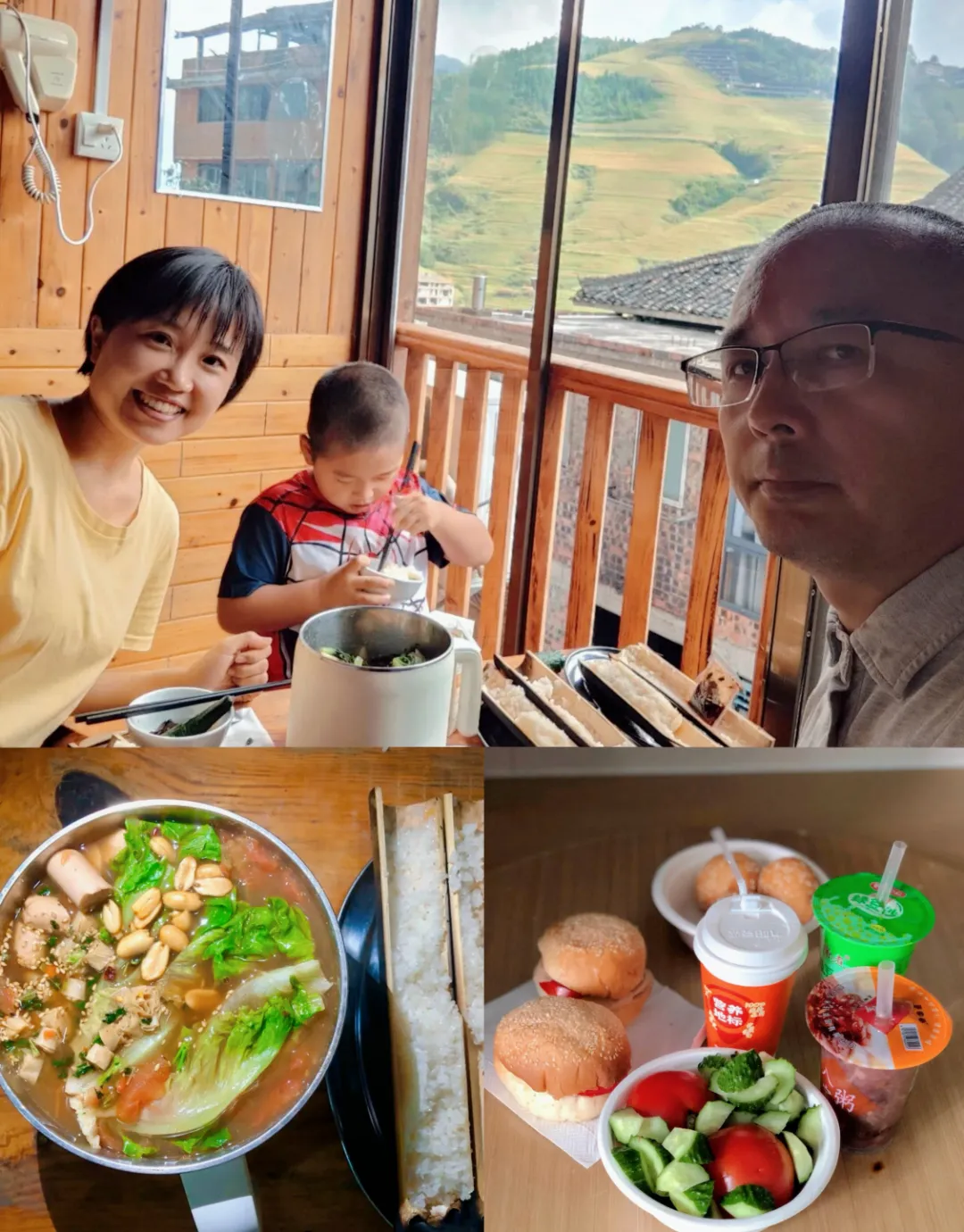 临行前,准备了一个小白锅,买了各种面条、豆干、榨菜、素肠、火锅底料等,一个小包全部囊括。到了当地,采购一些新鲜的蔬菜,在民宿自己动手丰衣足食。在龙脊梯田的木楼里,我们涮过火锅、煮过面,做过大炖菜,不少食材也都来自当地的农家,和孩子一起动手制作,其乐融融,看着外边的梯田美景,吃着自己做的饭,那一刻,彷佛我们已在这里生活许久。