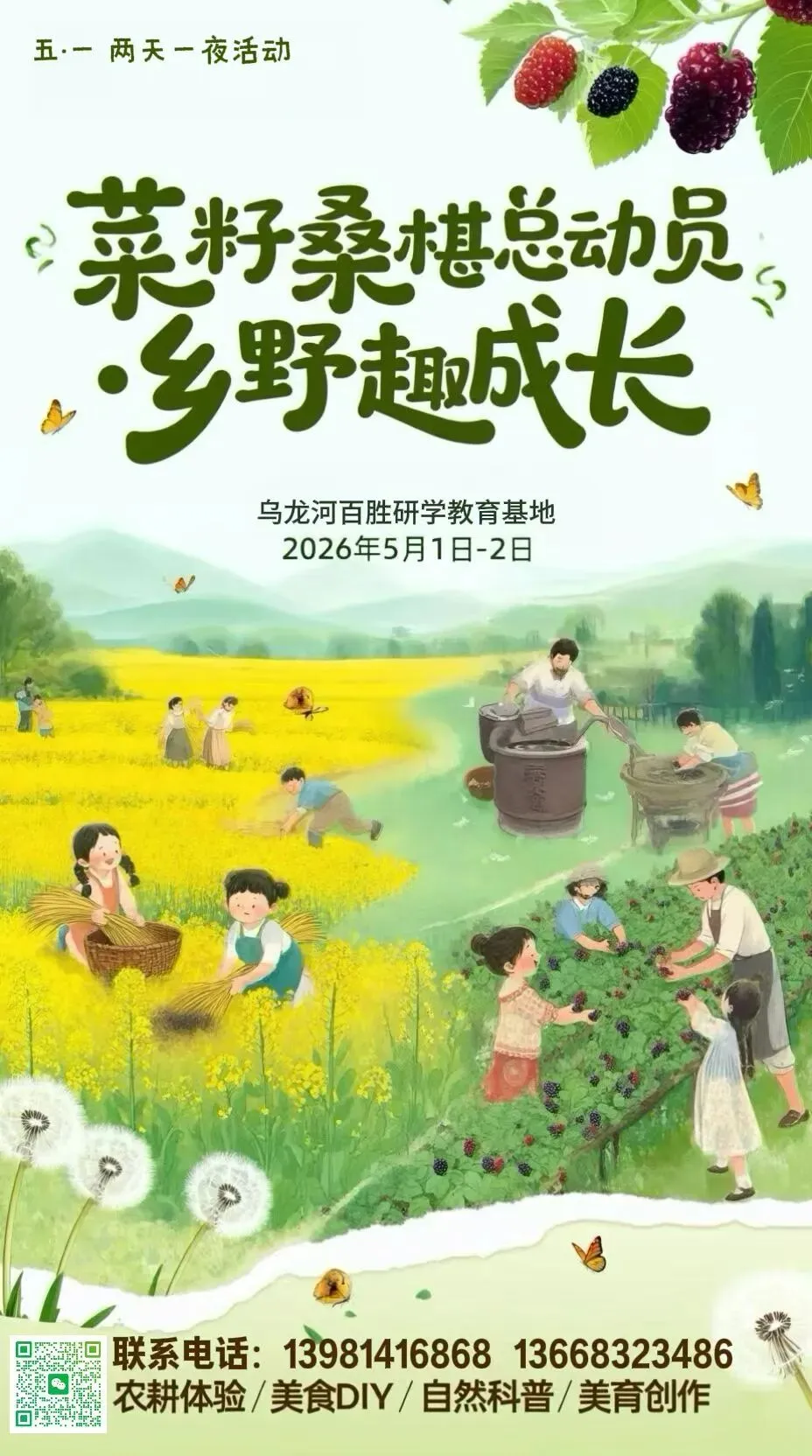 📅 2026年5月1日-2日主题:菜籽桑椹总动员·乡野趣成长活动内容:农耕收割、桑葚采摘、美食DIY、露天电影……让孩子真正“野”一次!
