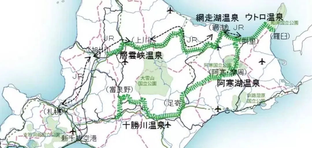 路线1:新千岁机场→十胜川温泉→带广→阿寒湖→宇登吕温泉→知床五湖→罗臼观鲸→纲走→东藻琴芝樱公园→层云峡→旭川