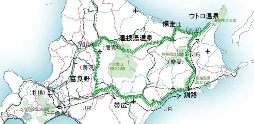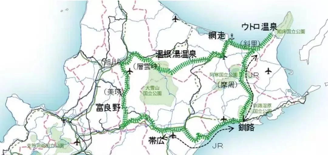 路线3:旭川机场→富良野→美瑛町→层云峡→温根汤温泉→纲走→知床五湖→宇登吕温泉→摩周湖→钏路(币舞桥)→川汤温泉→带广→十胜
