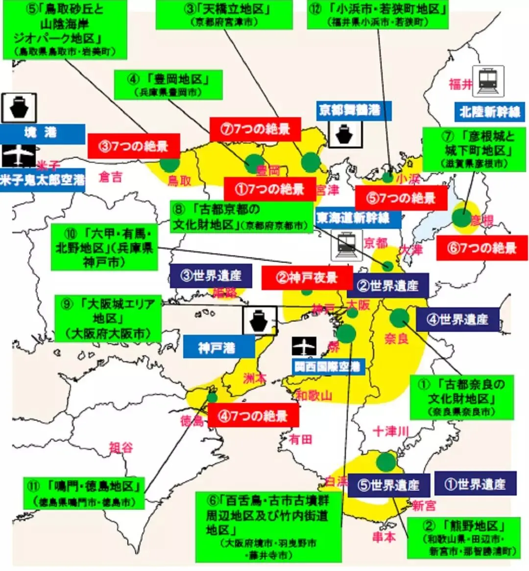 据日本观光局的调查,每年访日的外国游客中,超过一半以上的人是冲着日本的文化遗迹来的。关西观光局便抓住这一点,利用地域优势推出了文化遗传之旅与沿海绝境之旅。文化遗传之旅包括3条路线,沿海绝景之旅有2条路线。