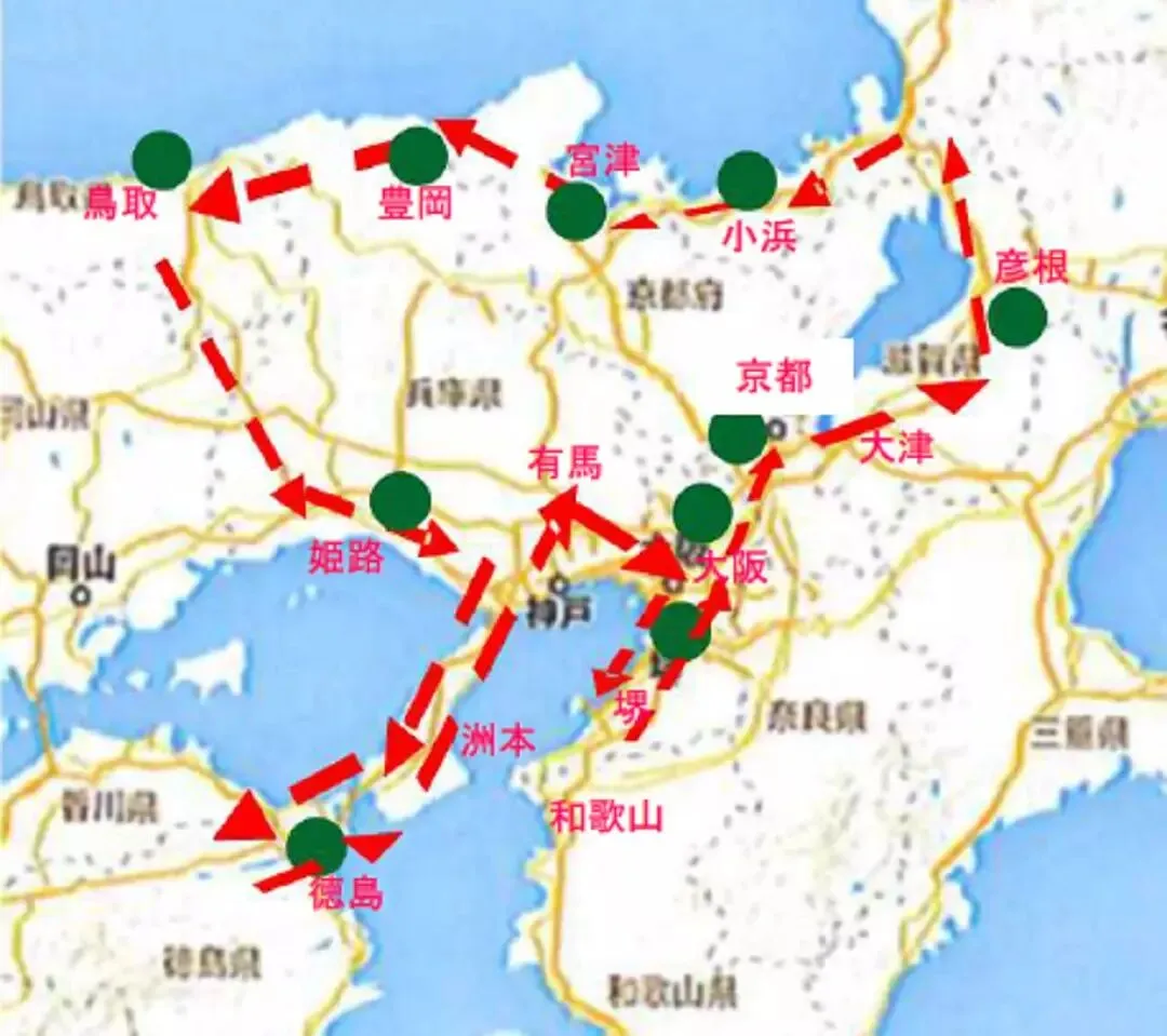 沿海绝景路线2:大阪地区→京都地区→大津·雄琴→彦根→若狭小浜→三方五湖→丰冈→山阴海岸→湖山池和鸟取沙丘→三朝温泉→姬路→德岛→神户→堺市