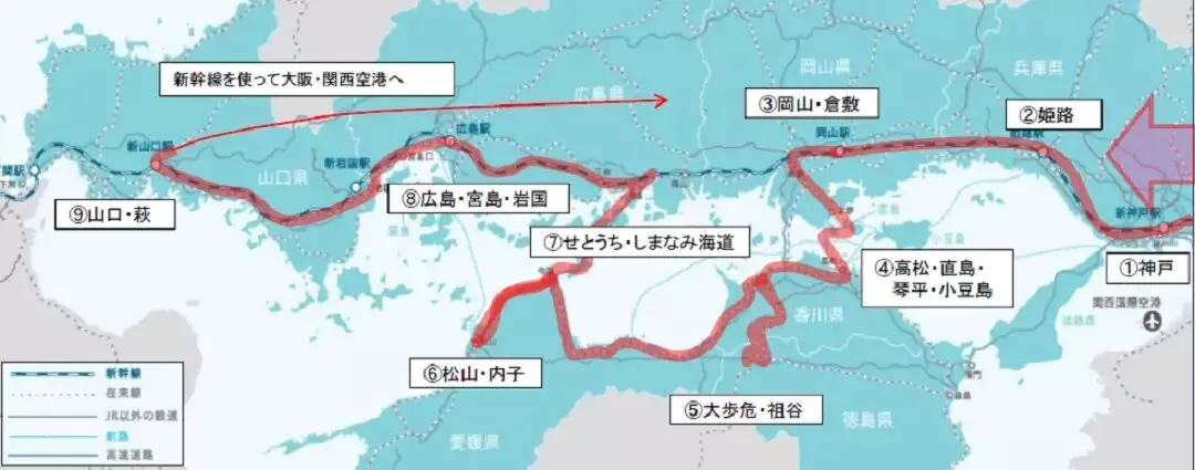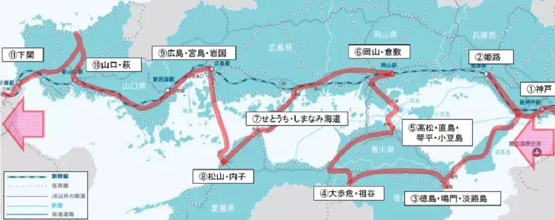 历史与艺术的约会:神户市→姬路市→冈山市→仓敷市→直岛→高松市→祖谷溪→琴平市→松山市→今治市→shimanami海道→广岛市