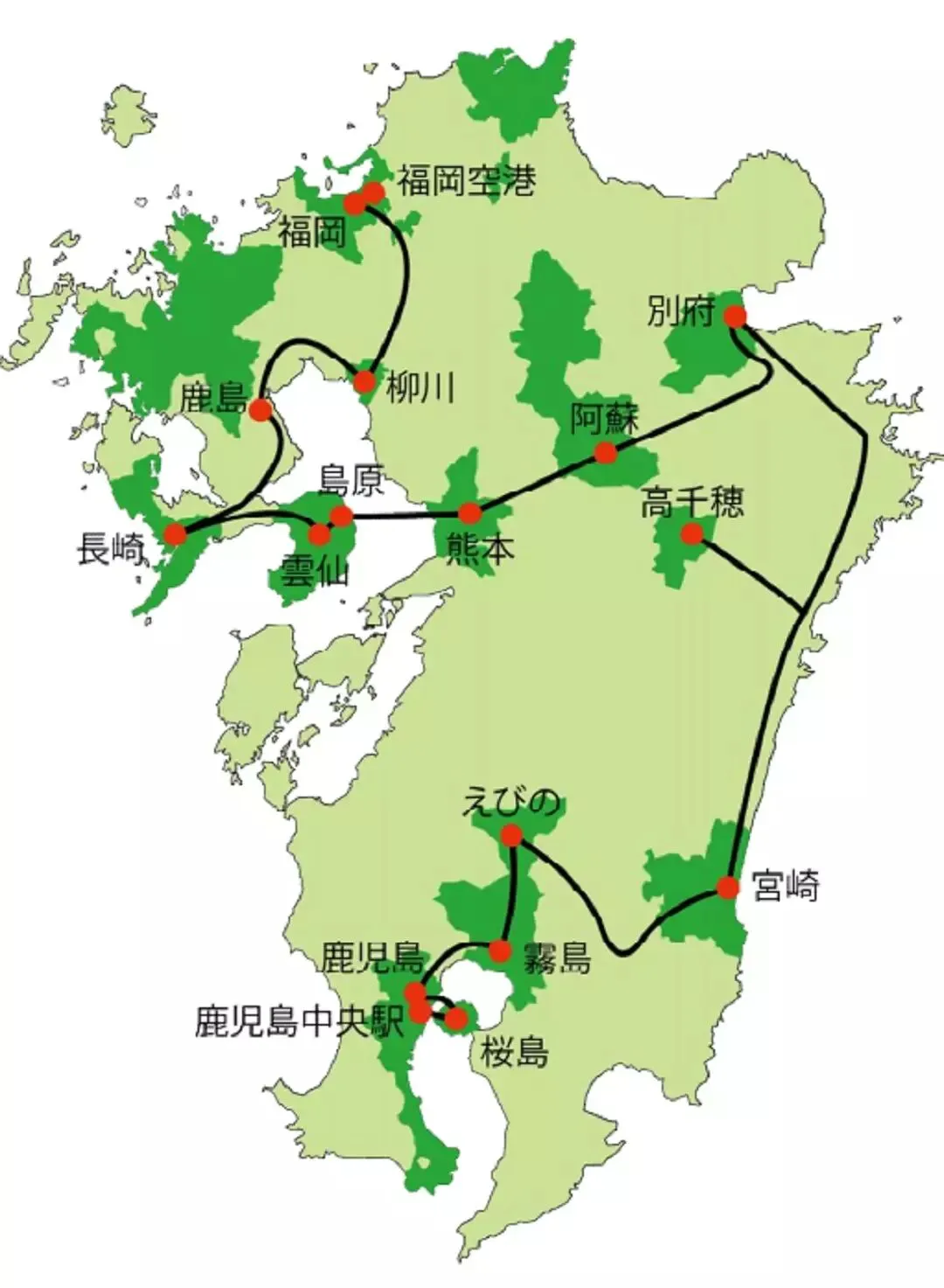 火山之旅:樱岛→鹿儿岛→雾岛神宫→宫崎→高千穗峡→别府温泉→阿苏→熊本→云仙温泉→长崎→军舰岛→福冈