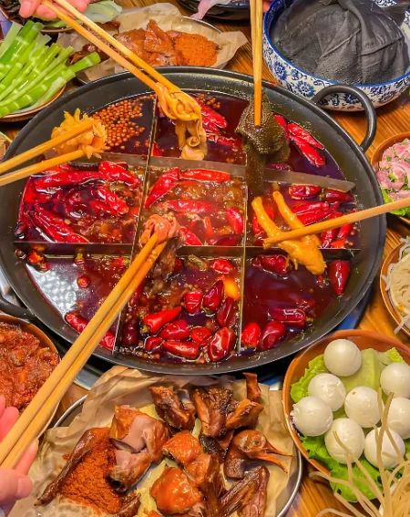 吃火锅别去装修太好的地方,要去那种开在居民楼下、甚至防空洞里的老火锅。牛油味要重到第二天洗澡还能闻到才正宗。必点菜:毛肚、鸭肠、贡菜、耗儿鱼。油碟要用香油加蒜泥,这是解辣护胃的神器。推荐去“大龙燚”或者“小龙坎”的老店,虽然要排队,但值得。人均100元左右。