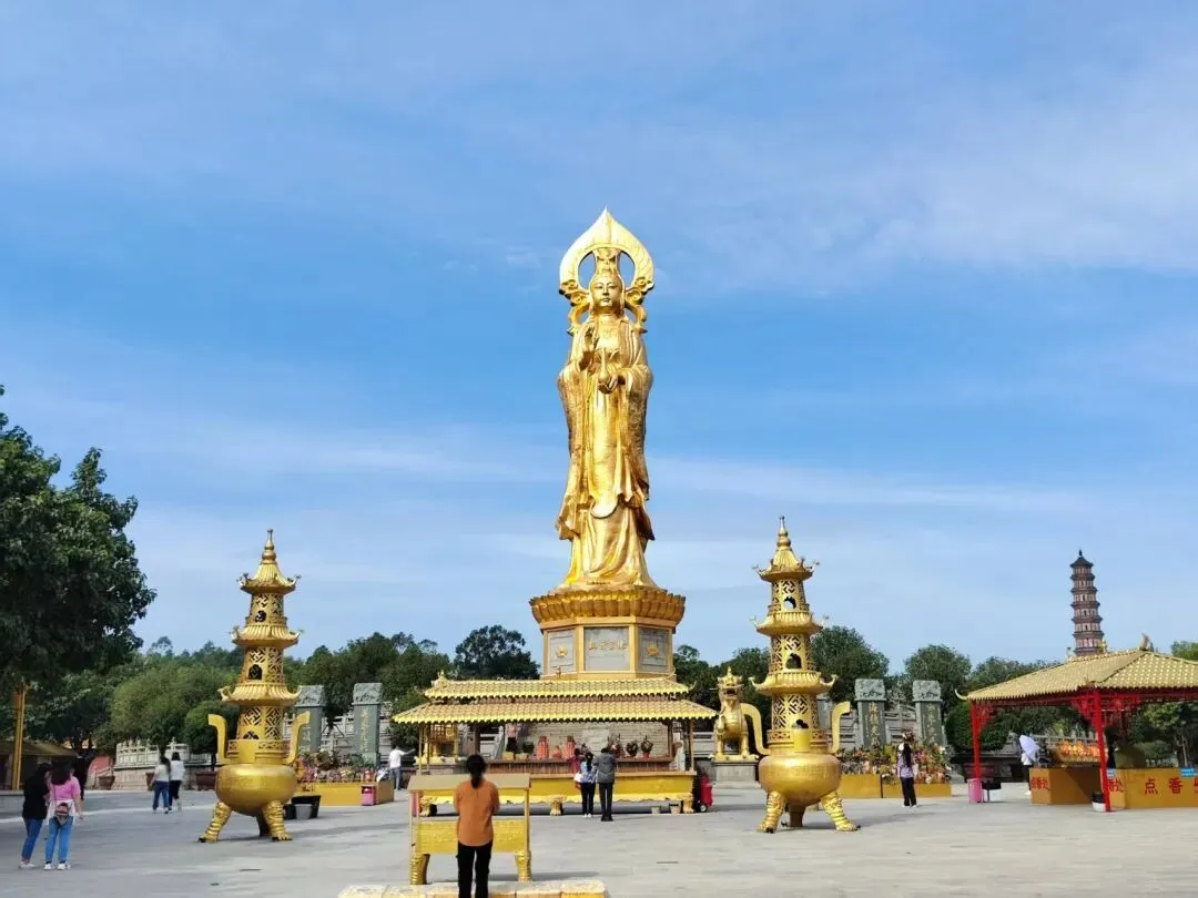 4.莲花山旅游区 核心介绍:4A级景区,位于番禺区石楼镇东北部,是由48座红色砂岩低山组成的山脉,属丹霞地貌。从明代始,山体多处被开采为石矿场,遗留其中一处呈莲花状之巨石,故名莲花山。现存2000多年历史的古采石场遗址,是国内少见的“人工丹霞”奇迹,也是中国两大古矿场之一,为全国重点文物保护单位。顶峰有高大的镇海观影雕像。 开放时间:7:00-17:00 门票:54元 交通:离地铁口较远,且远离市区,建议打车前往。 游玩贴士:建议游玩2—3小时,景区绿植丰富,山间点缀着人文建筑,颇有雅致。如果不想走路,景区也有观光车,10元/人