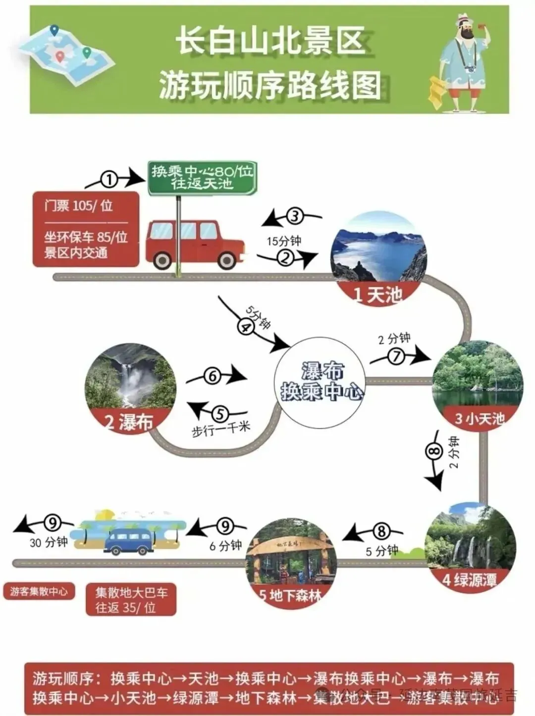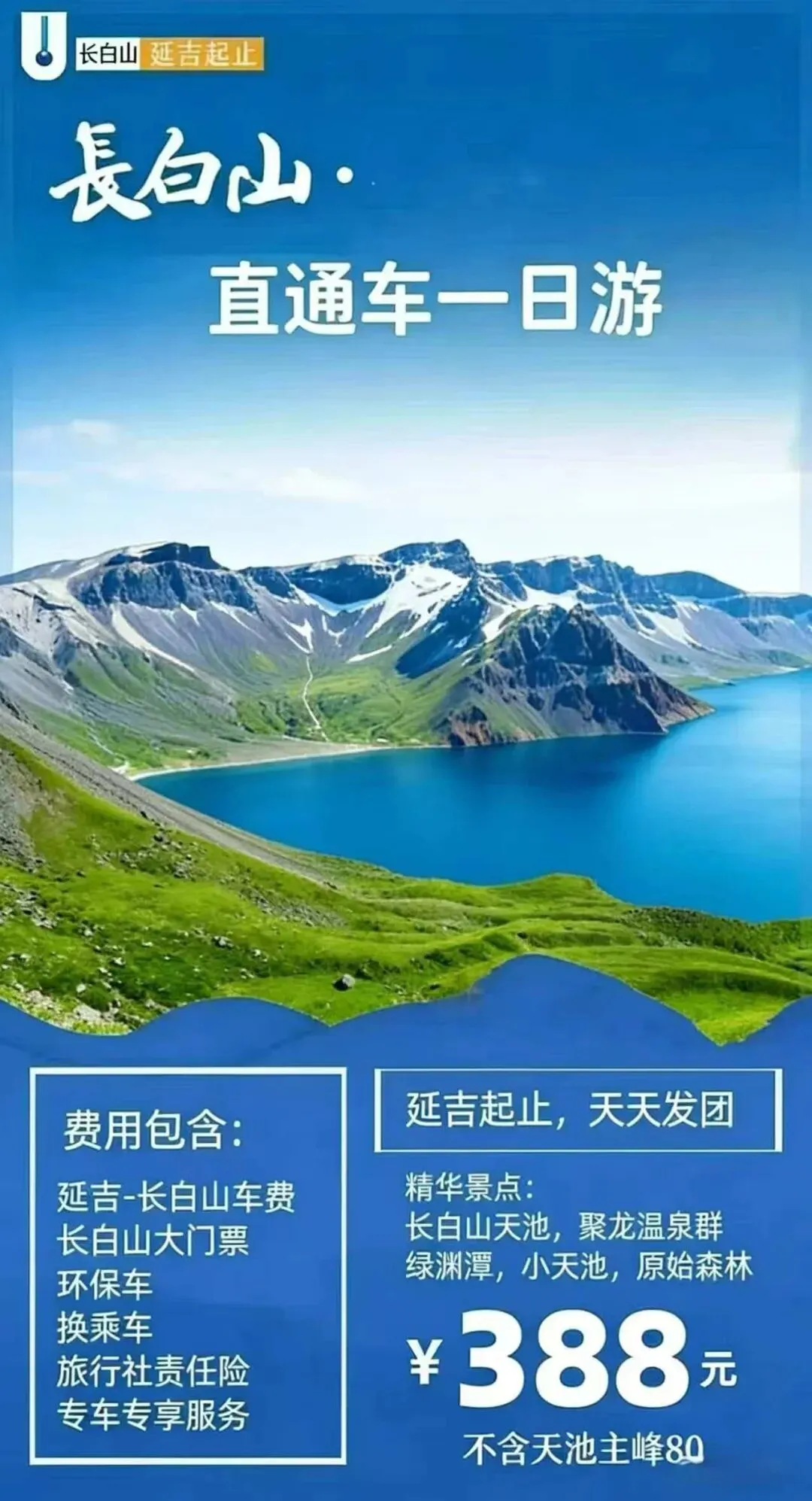 经典行程:延吉 → 长白山北坡 → 天池 → 长白瀑布 → 聚龙温泉 → 绿渊潭 → 返回延吉