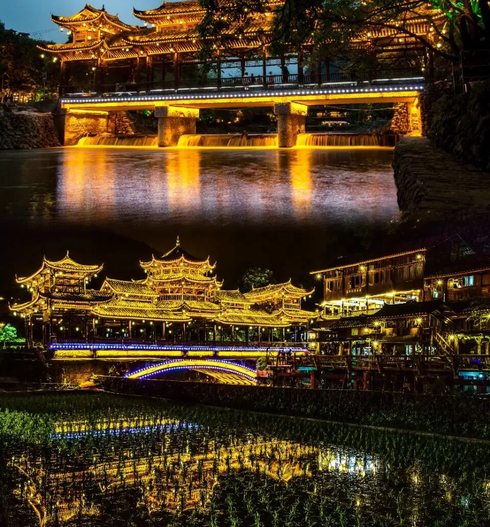 苗族游方(3号风雨桥头):傍晚到夜晚,苗族青年会在这里情歌对唱 “游方”,家长可以带孩子感受苗家的浪漫文化,免费参观,夜晚的灯光下氛围格外温馨。
