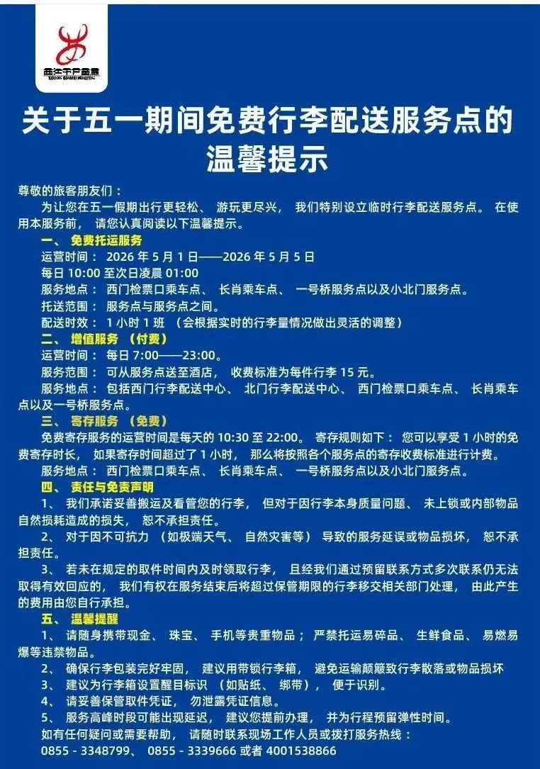 服务地点:西门行李配送中心、北门行李配送中心、西门检票口乘车点、长肖乘车点、一号桥服务点。