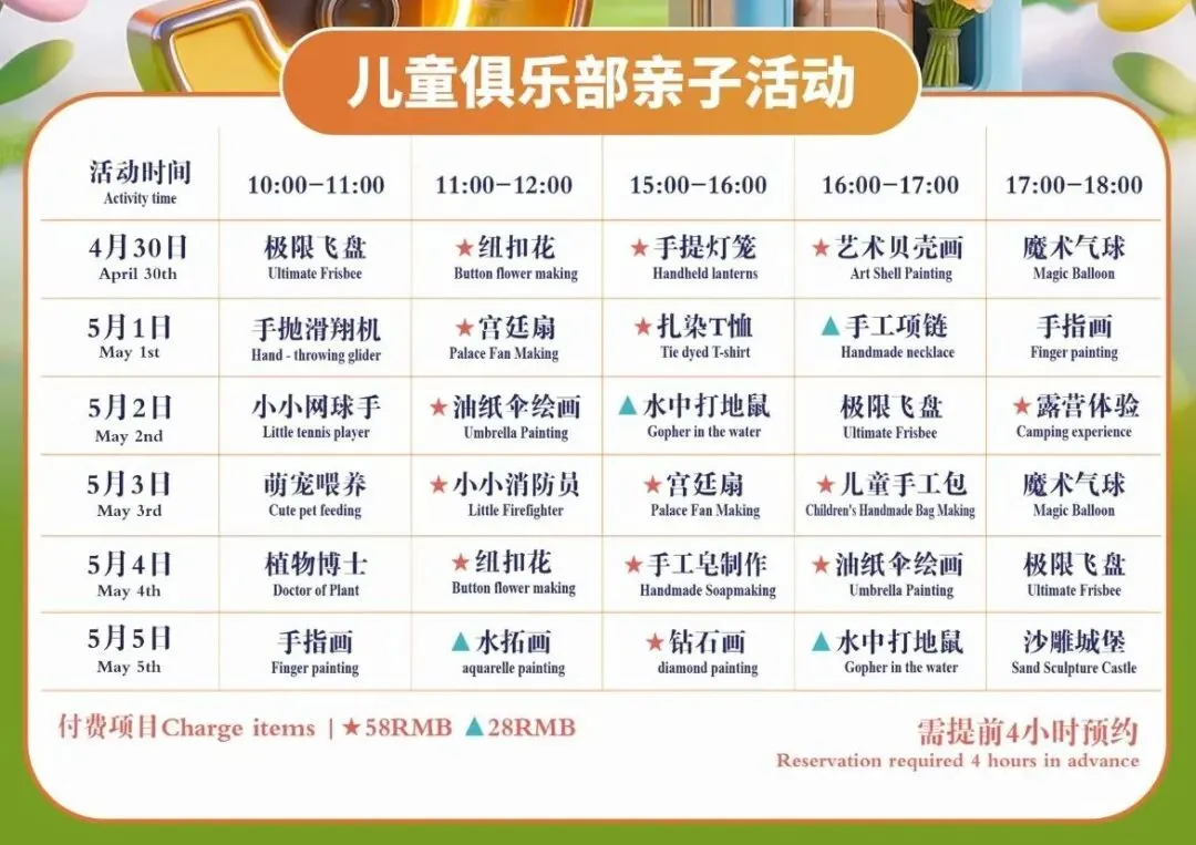 4月30日-5月5日,酒店每天都有超丰富的运动、手工、体验类活动。