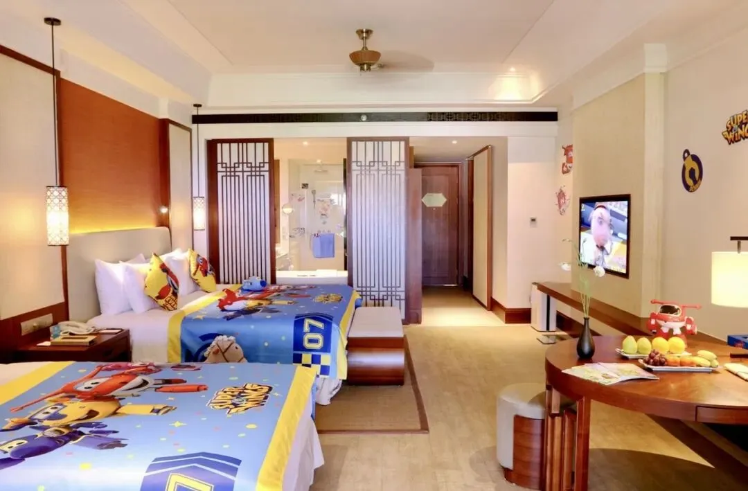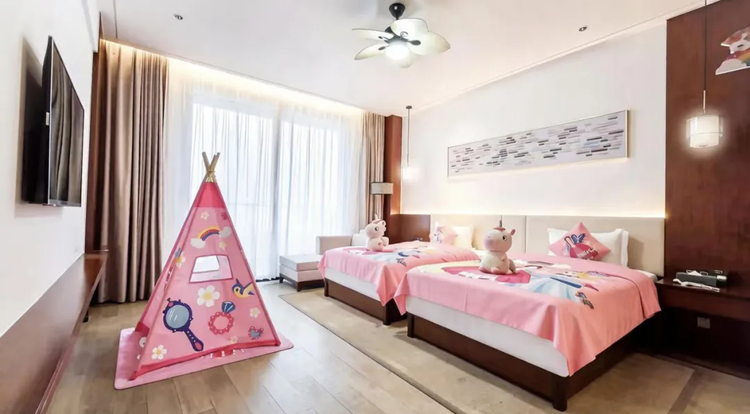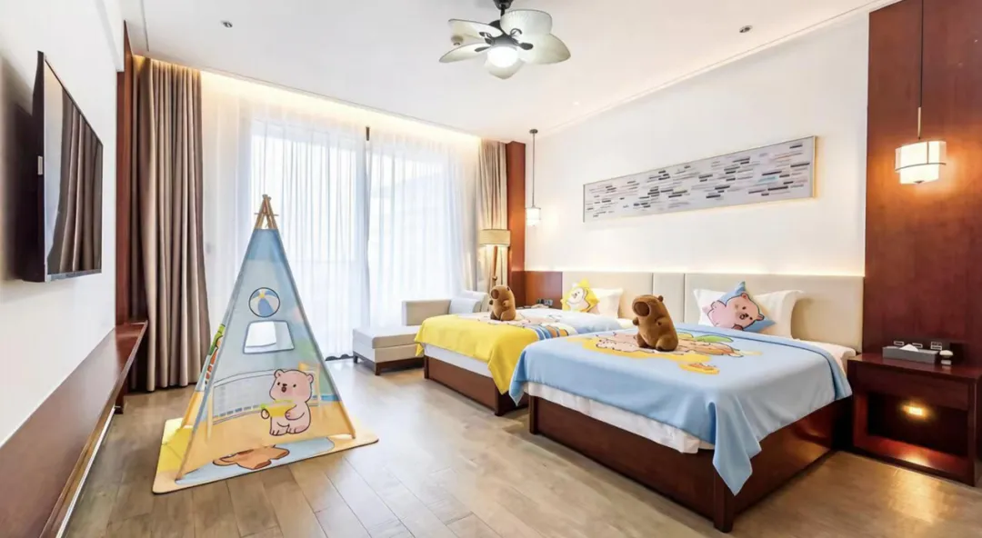 入住亲子套房,家有女宝必冲粉色梦幻公主房,一秒穿越童话书;还有软萌卡皮巴拉主题房,简直不要太治愈。