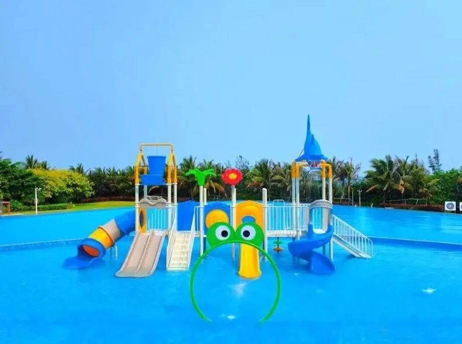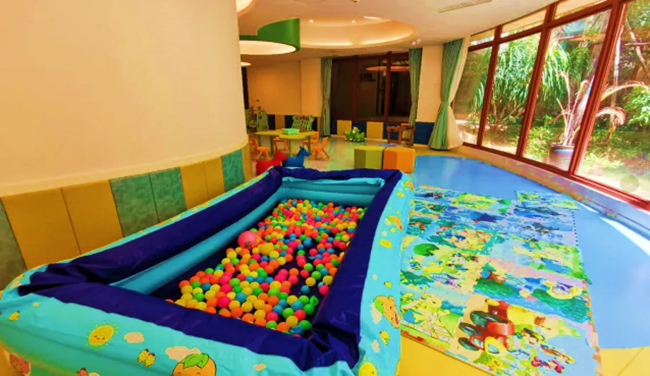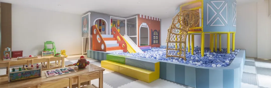 儿童娱乐室里有不少玩具供娃玩耍,室外泳池可以玩水枪、水上筏板,孩子可以快乐打水仗。