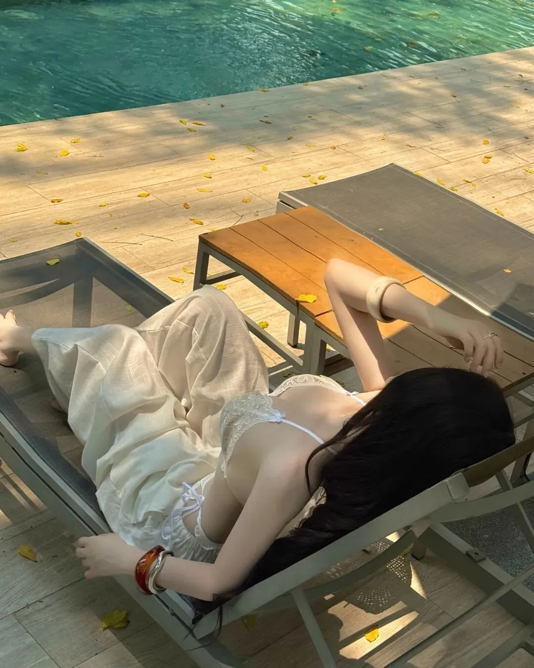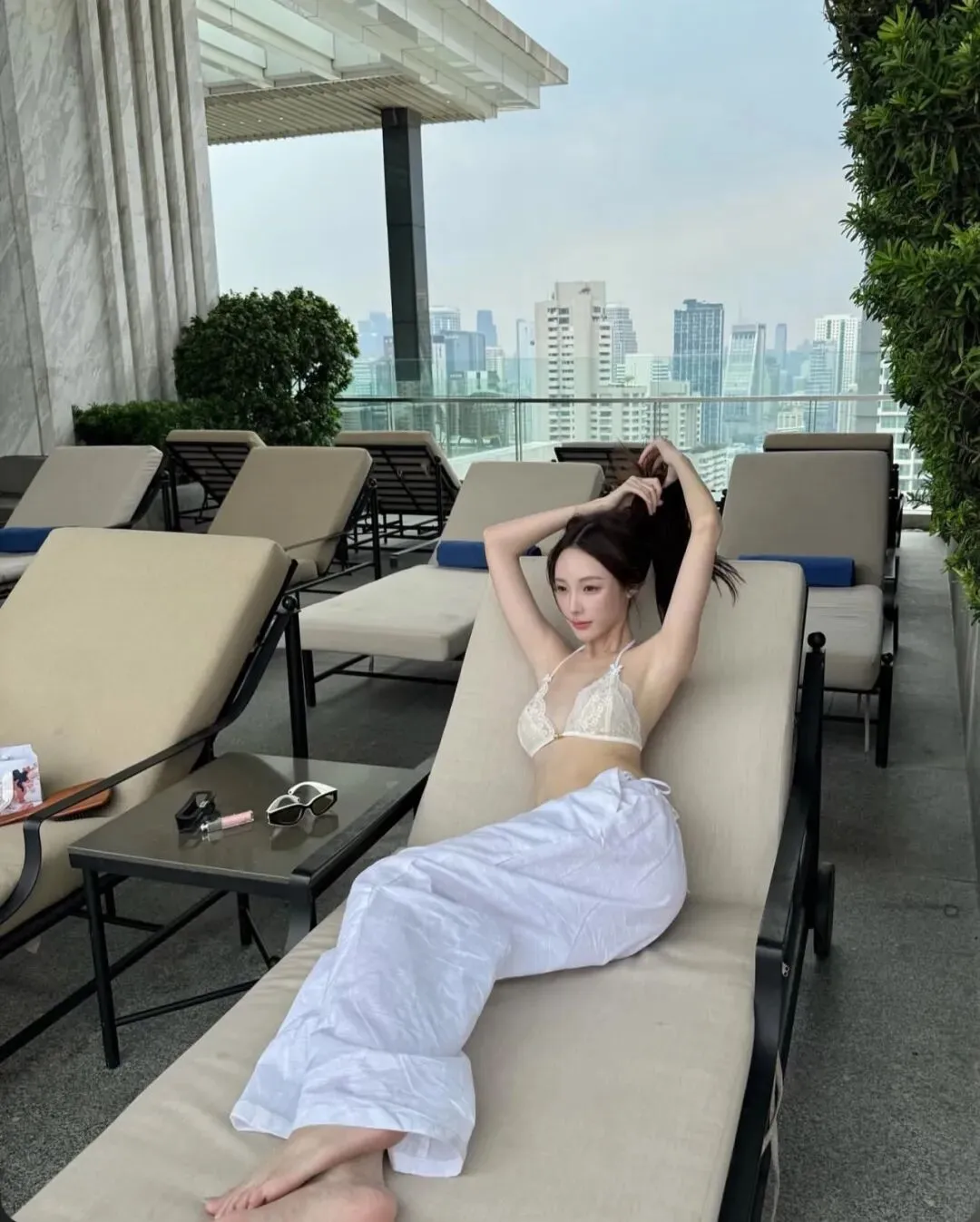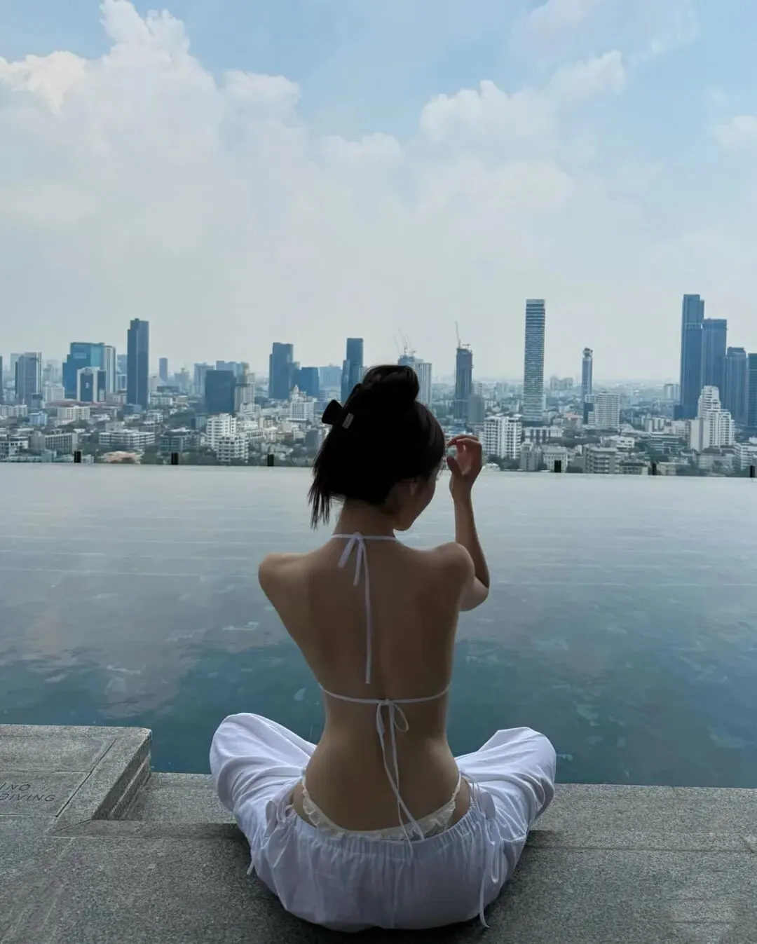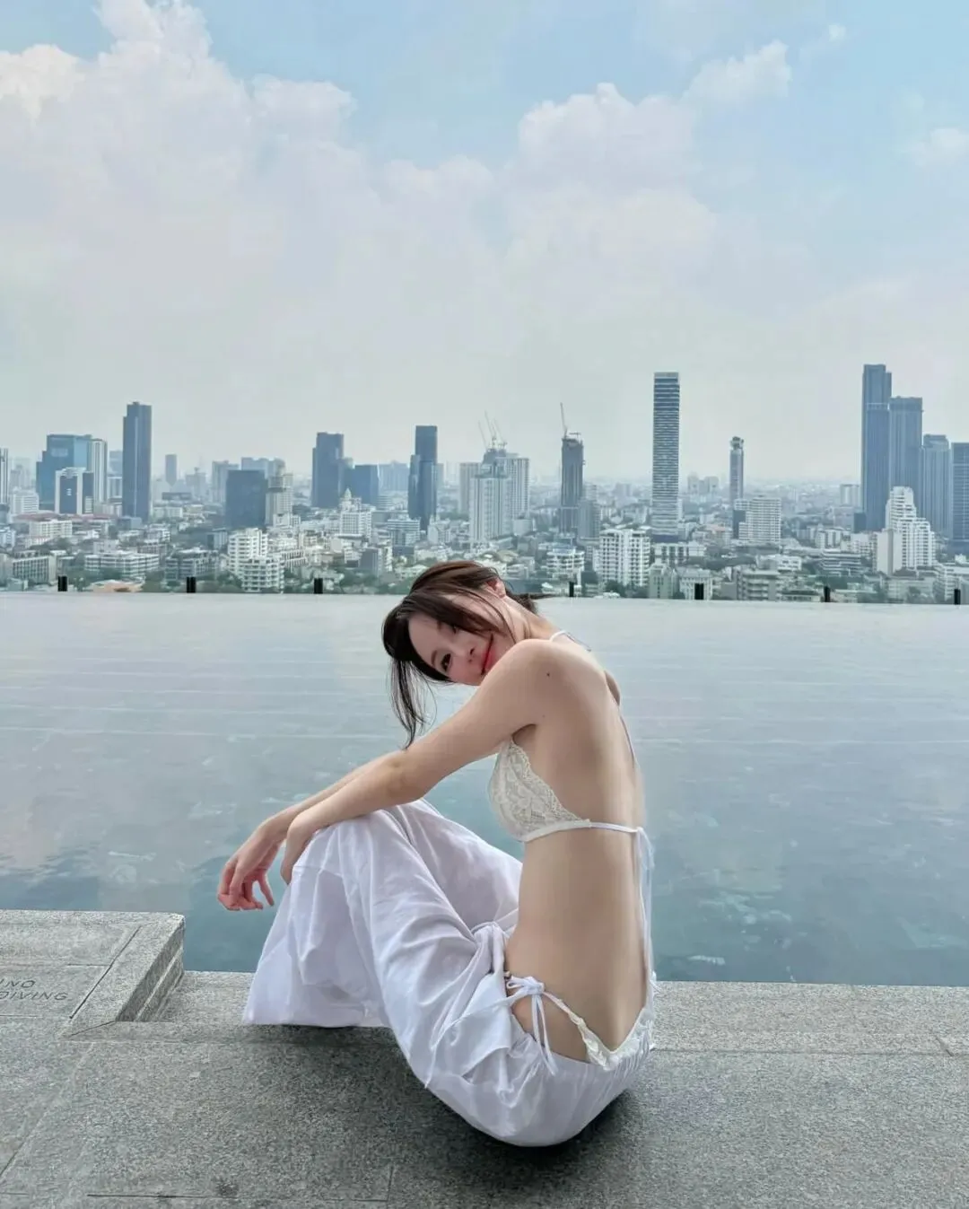 最终,当旅程的节奏回归到万家灯火的城中露台或无边泳池旁,那种带有都市张力的穿搭便成了谢幕的终点。在城市的摩天轮廓与蔚蓝池水的映衬下,一套洁白的细带比基尼搭配随性的白色长裤,足以将在极高调性的留白构图中点亮视觉中心。拍照姿势的选择至关重要,采取低机位的仰拍或侧身蜷缩的姿态,利用池边大理石的几何线条作为视觉引导,能让肢体的延展显得尤为挺拔且富有力量感。目光可以调皮地锁定镜头,也可以柔和地掠过远方那一抹渐变的晚霞,通过这种重心的偏移打破画面的死板。在这种环境下,所有的繁琐配饰都是多余的,光影本身的颗粒感就是最好的装饰。它记录了我们在迁徙中寻找平衡的每一个时刻,也记录了我们依然愿意为生活起舞的原始动力。愿每一位在路上的女性,都能在那抹随性长发的飞舞中,找到那套最契合当下心境的行头,在这大千世界里,优雅且坚定地走出属于自己的美丽轨迹,让每一个平凡的瞬间都因这份用心的记录而变得灿烂夺目。