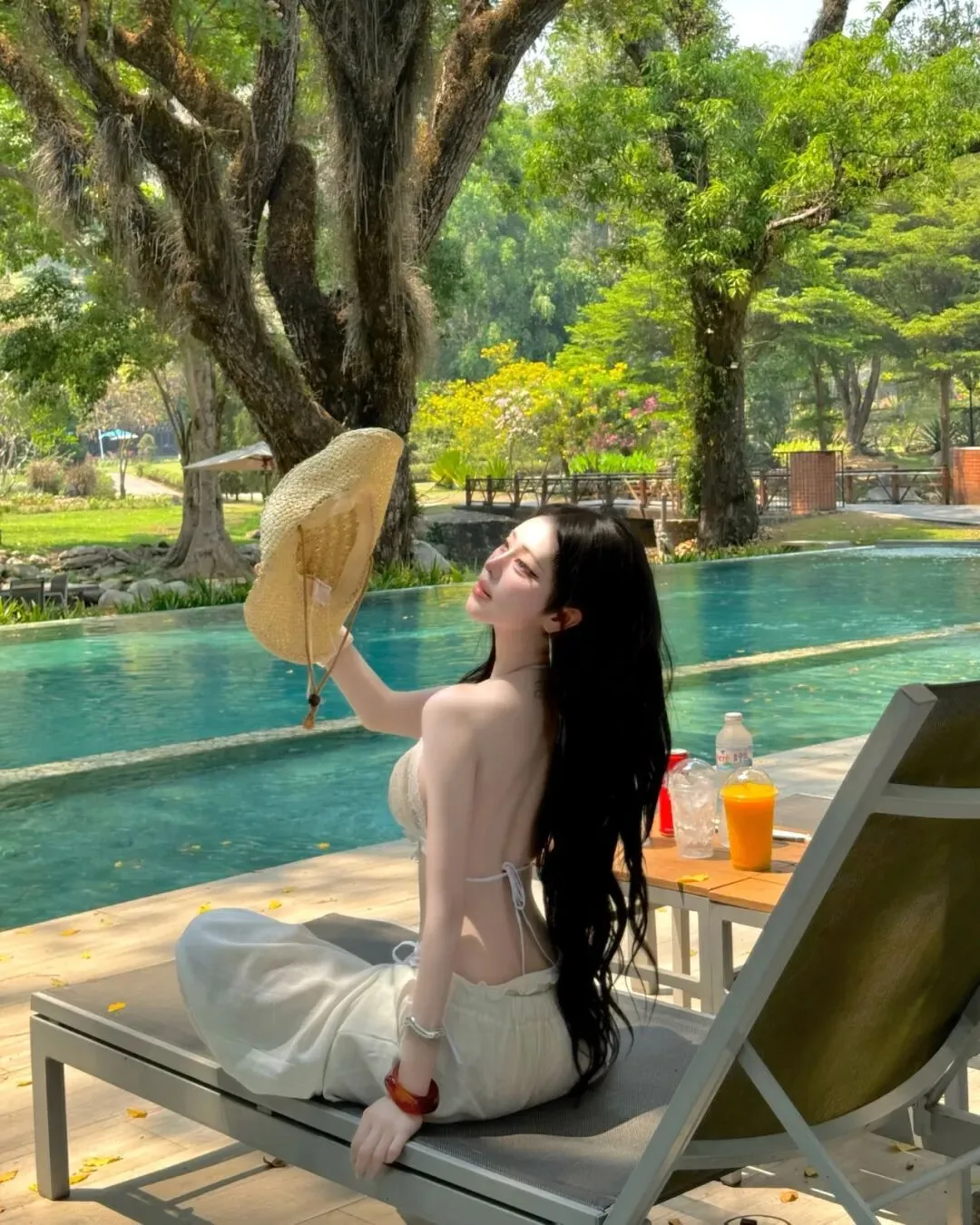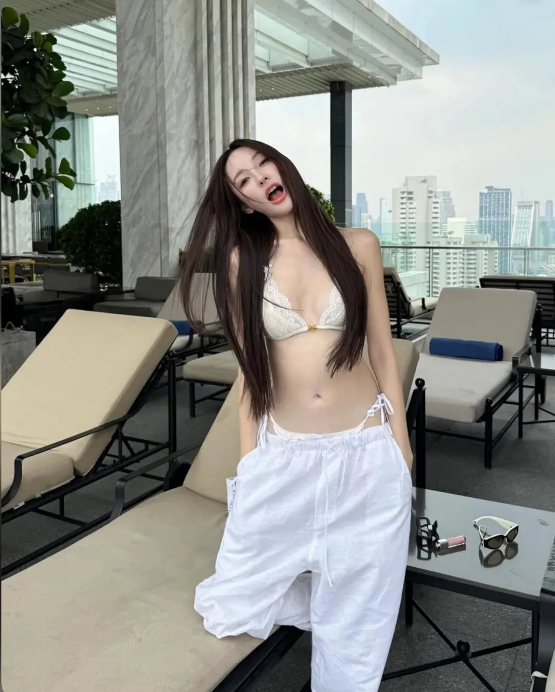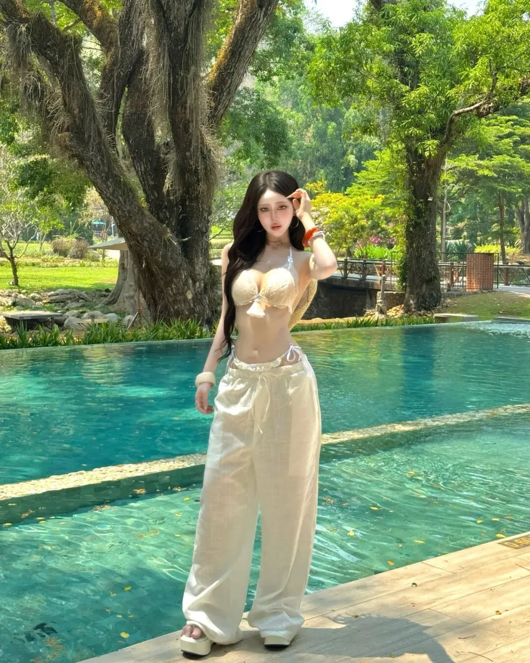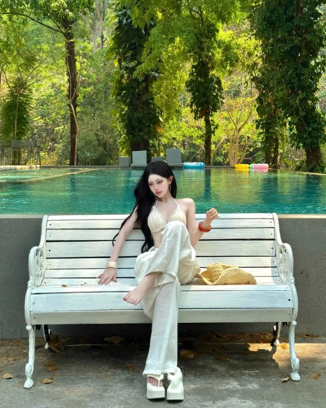 最终,当旅程的节奏回归到万家灯火的城中露台或无边泳池旁,那种带有都市张力的穿搭便成了谢幕的终点。在城市的摩天轮廓与蔚蓝池水的映衬下,一套洁白的细带比基尼搭配随性的白色长裤,足以将在极高调性的留白构图中点亮视觉中心。拍照姿势的选择至关重要,采取低机位的仰拍或侧身蜷缩的姿态,利用池边大理石的几何线条作为视觉引导,能让肢体的延展显得尤为挺拔且富有力量感。目光可以调皮地锁定镜头,也可以柔和地掠过远方那一抹渐变的晚霞,通过这种重心的偏移打破画面的死板。在这种环境下,所有的繁琐配饰都是多余的,光影本身的颗粒感就是最好的装饰。它记录了我们在迁徙中寻找平衡的每一个时刻,也记录了我们依然愿意为生活起舞的原始动力。愿每一位在路上的女性,都能在那抹随性长发的飞舞中,找到那套最契合当下心境的行头,在这大千世界里,优雅且坚定地走出属于自己的美丽轨迹,让每一个平凡的瞬间都因这份用心的记录而变得灿烂夺目。