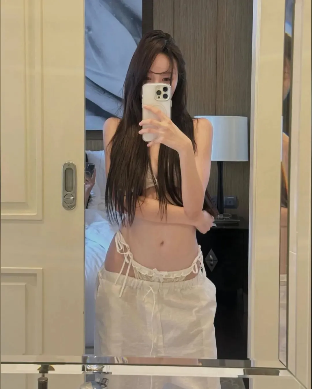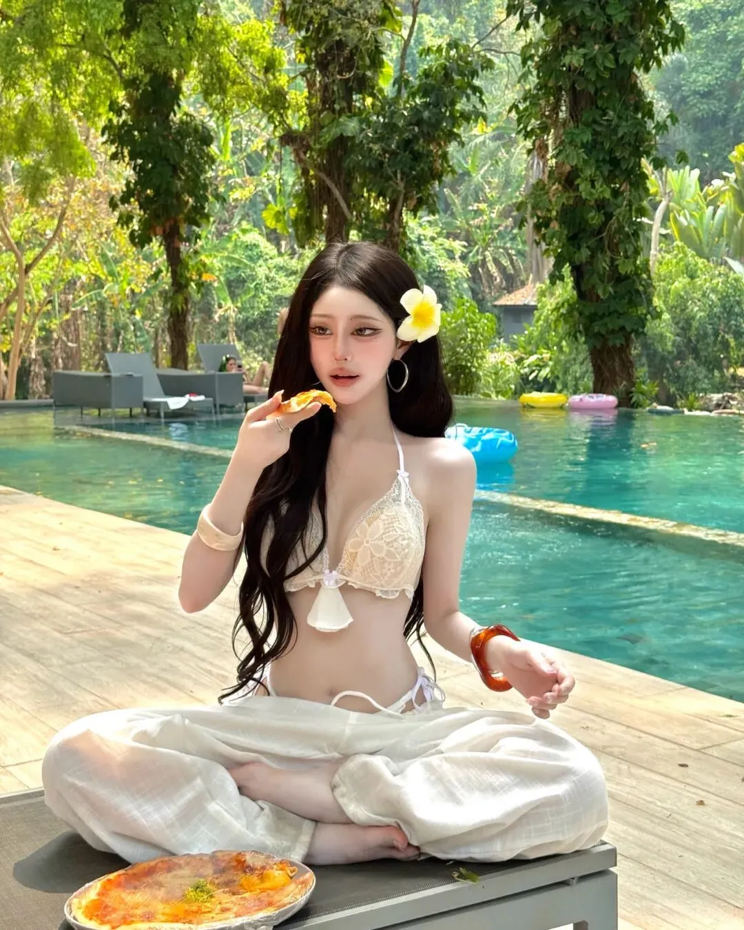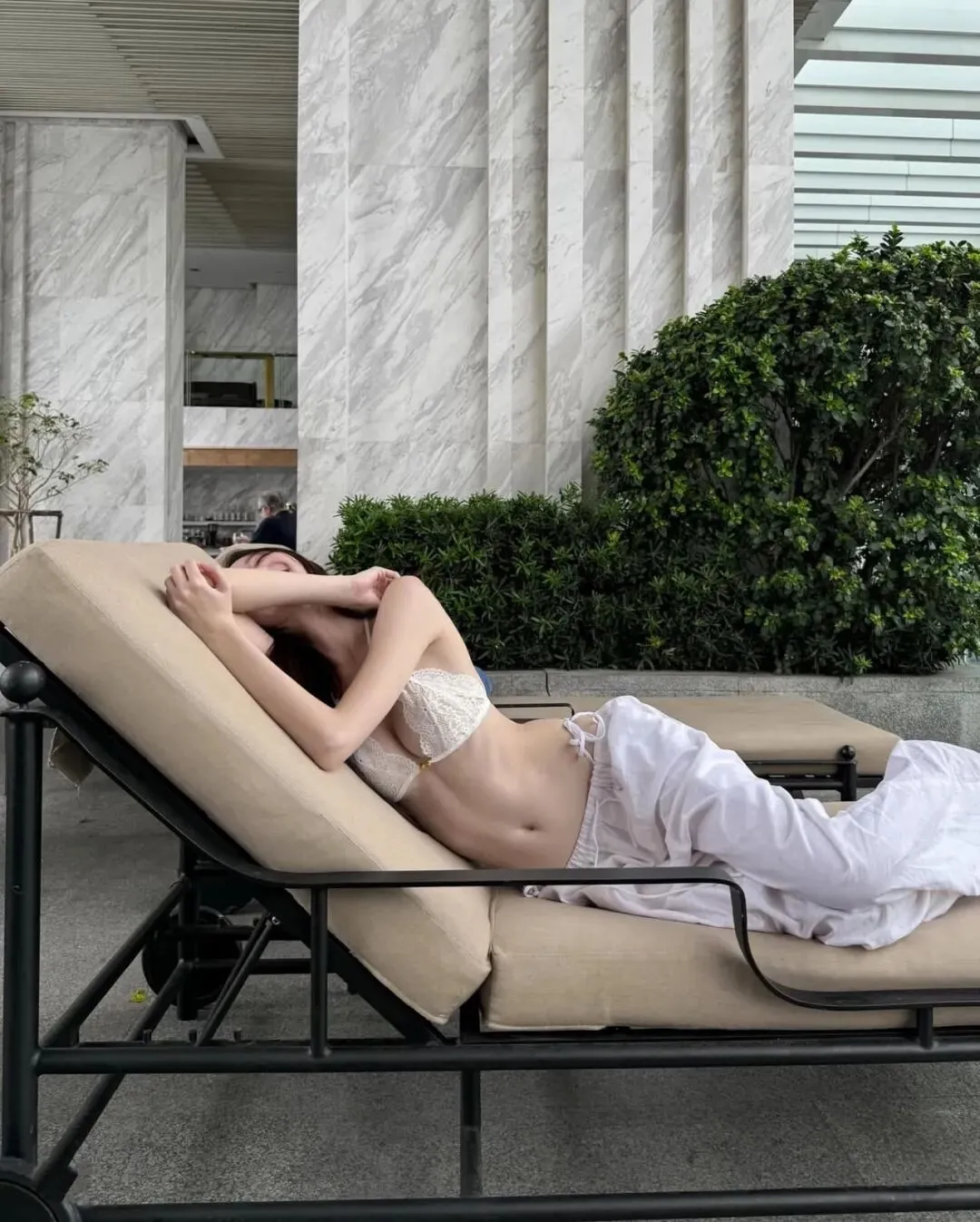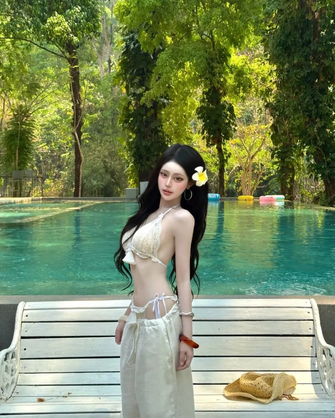 最终,当旅程的节奏回归到万家灯火的城中露台或无边泳池旁,那种带有都市张力的穿搭便成了谢幕的终点。在城市的摩天轮廓与蔚蓝池水的映衬下,一套洁白的细带比基尼搭配随性的白色长裤,足以将在极高调性的留白构图中点亮视觉中心。拍照姿势的选择至关重要,采取低机位的仰拍或侧身蜷缩的姿态,利用池边大理石的几何线条作为视觉引导,能让肢体的延展显得尤为挺拔且富有力量感。目光可以调皮地锁定镜头,也可以柔和地掠过远方那一抹渐变的晚霞,通过这种重心的偏移打破画面的死板。在这种环境下,所有的繁琐配饰都是多余的,光影本身的颗粒感就是最好的装饰。它记录了我们在迁徙中寻找平衡的每一个时刻,也记录了我们依然愿意为生活起舞的原始动力。愿每一位在路上的女性,都能在那抹随性长发的飞舞中,找到那套最契合当下心境的行头,在这大千世界里,优雅且坚定地走出属于自己的美丽轨迹,让每一个平凡的瞬间都因这份用心的记录而变得灿烂夺目。