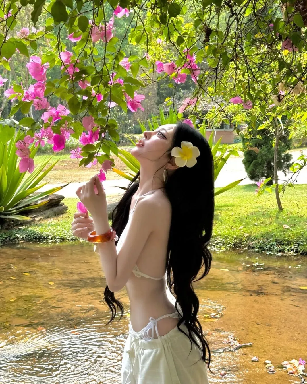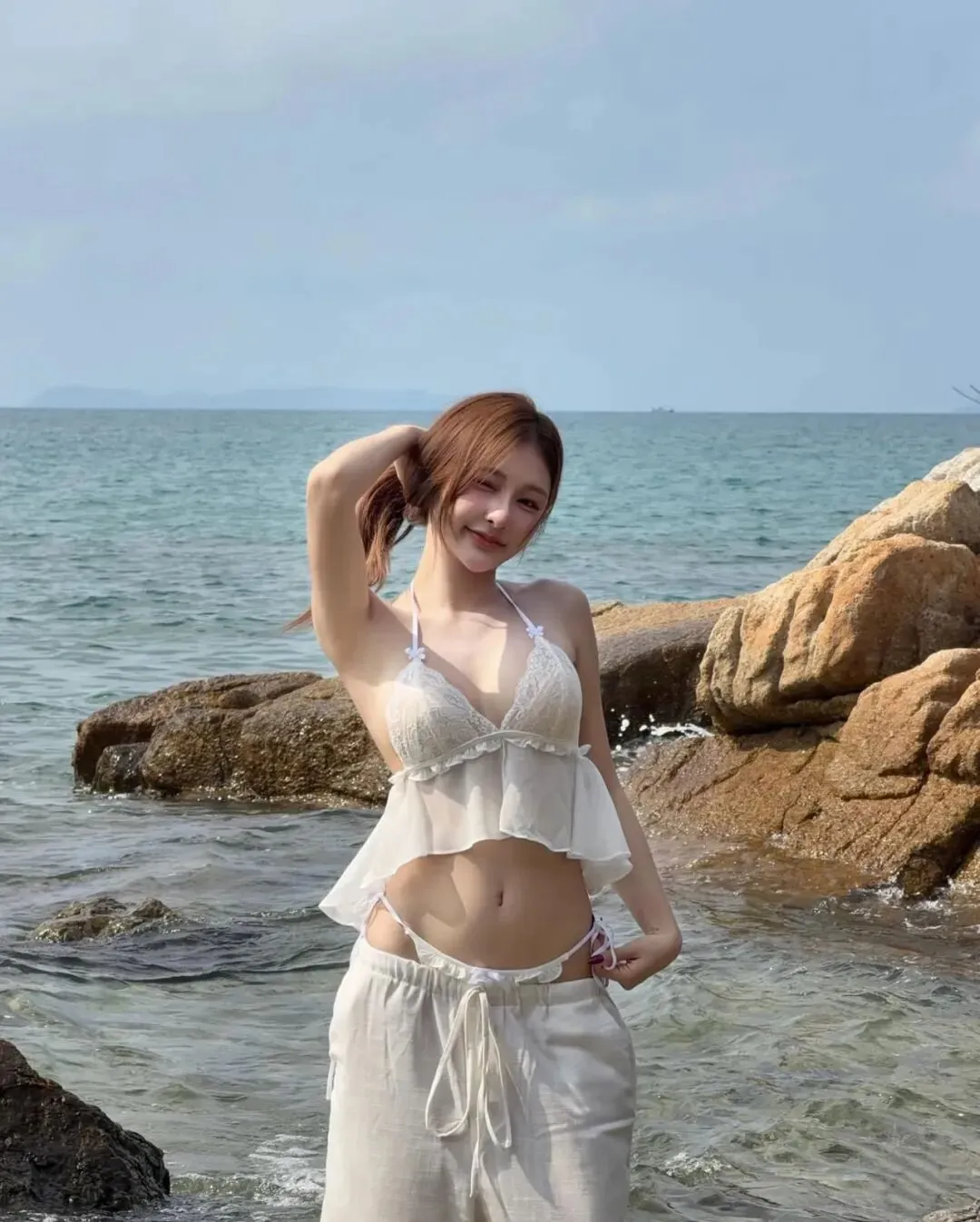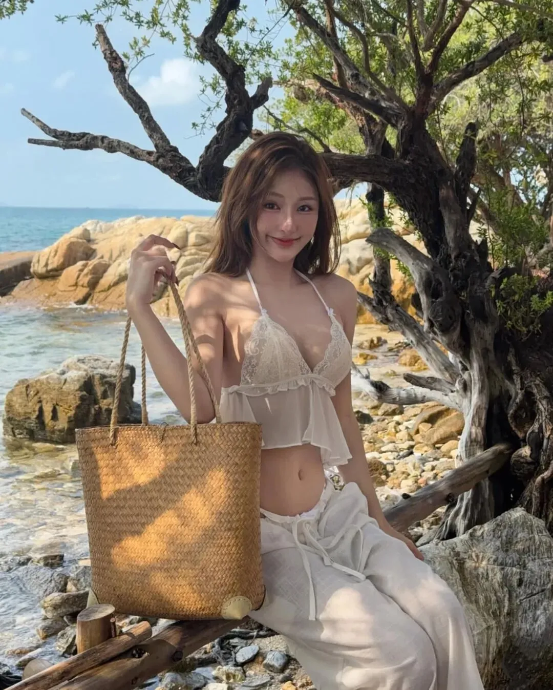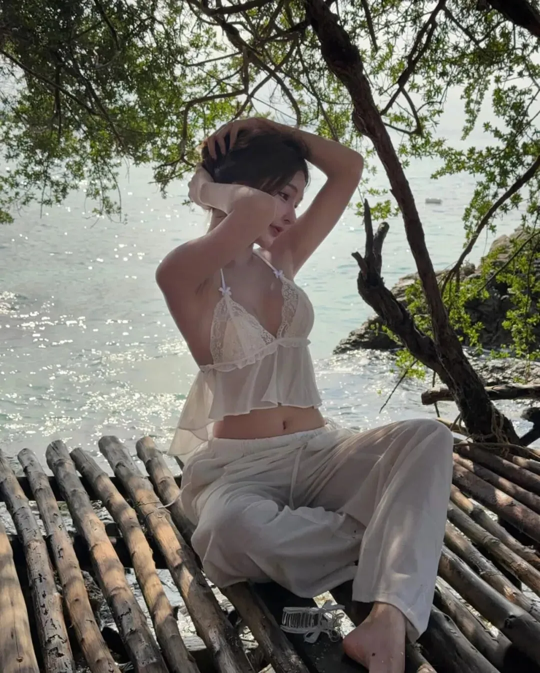 转场至充满异域格调的海滨森林,当粗粝的树干与波光粼粼的海面构成复古的画框,穿搭的逻辑应随之转向一种极致的柔美与力量的平衡。一袭米白色的层叠薄纱吊带套装,在阳光的直射下透出几近透明的通透感,它是捕获柔光、致敬旷野的绝佳媒介。在这种极其开阔的语境里,身体本身就是最灵动的艺术装置。比起生硬的挺拔,我更倾向于在石滩边缘采取一种松弛的席地姿态,单手自然地撩拨发丝,让视线游离于镜头之外,去呼吸那份咸湿的海风。此时的拍照技巧应聚焦于“纵深感”的营造,利用身后横斜的枝干与远处的点点白帆作为背景的注脚,将观众的焦点精准引向面部的立体轮廓与锁骨的曲线。这种穿搭赋予了旅人一种掌控感,让我们在这片充满张力的空间里,既能像飞鸟般轻盈,又能如礁石般坚定,让每一次快门的跳动都成为一场关于灵魂如何穿透虚荣、抵达真实的无声仪式,记录下一段关于生长与自由的灵魂舞步。