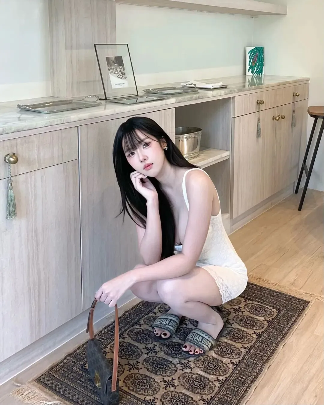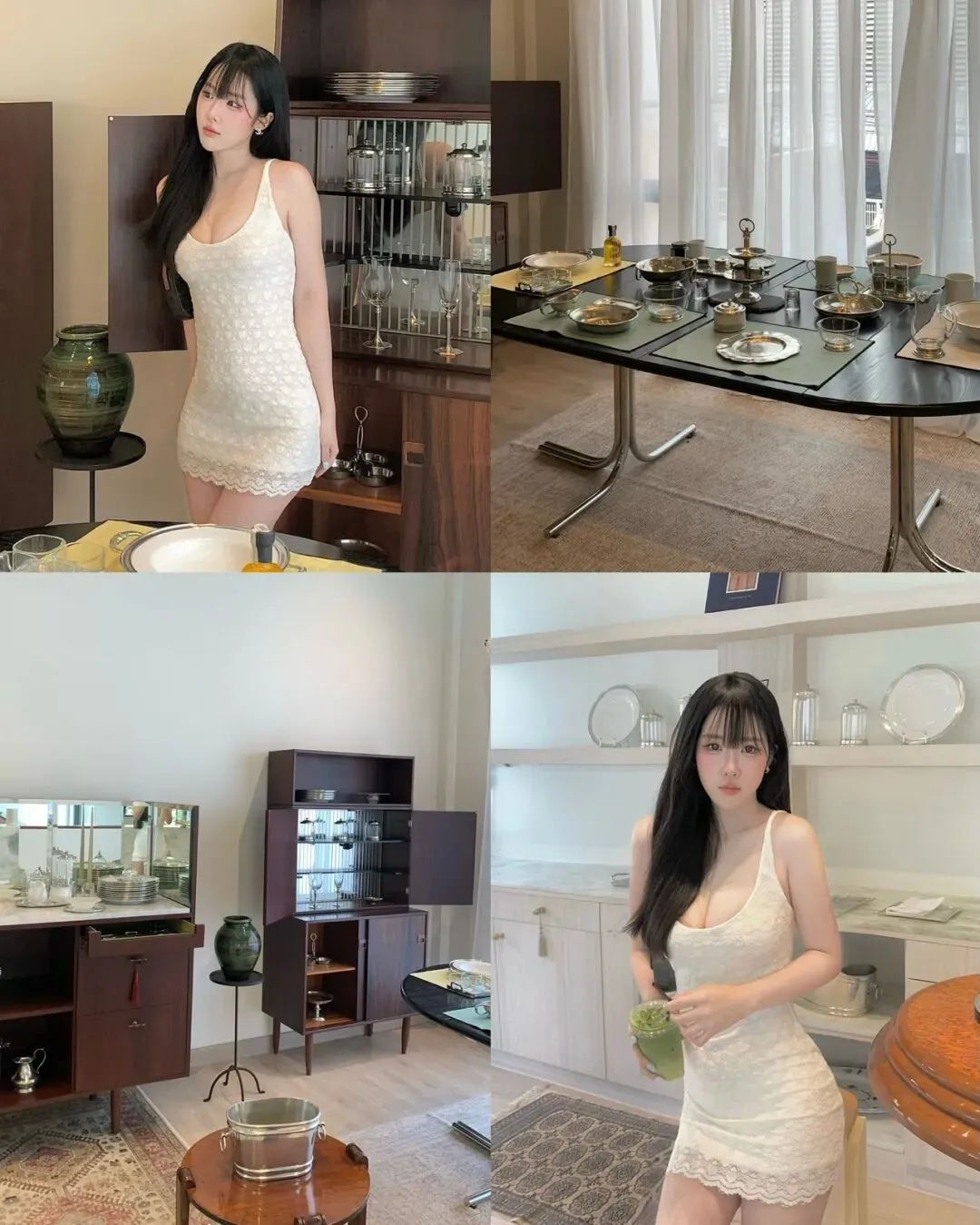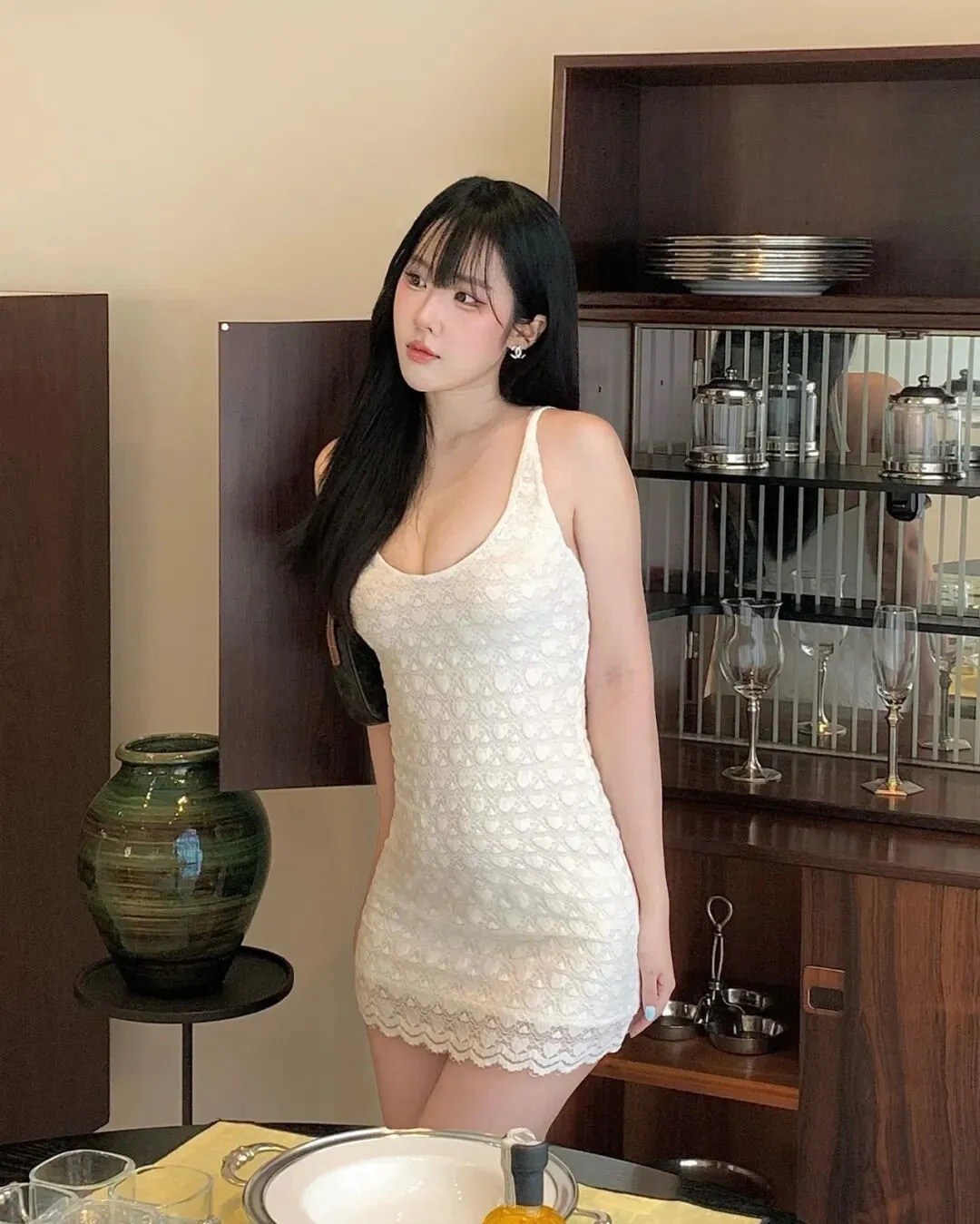 若步入写满现代审美的室内陈列空间或静谧的艺术廊道,穿搭的使命则演变成了一场关于材质肌理与知性气质的深度碰撞。在一排质感深邃的红木橱柜前,一袭乳白色的针织钩花修身裙裙足以完成对空间灵魂的收割。这种穿搭的奥妙在于其对身形的极致包裹与留白,针织材质的温润软糯消解了建筑线条的冷硬,而蕾丝边的点缀则在不经意间勾勒出迷人的曲线美感。拍照姿势上,可以尝试一种带有“疏离感”的侧首:单手微拢长发,目光投向橱柜中闪烁的玻璃器皿,利用环境光影的明暗交替去重塑身体的轮廓。这种构图呈现出一种“去表演化”的高级真实,向外界传递出一种不费力的优雅与自持。所谓的风格分享,本质上是关于如何在纷繁的色彩中寻找自我的坐标,通过这一层薄如蝉翼的织物,过滤掉外界的工业化浮躁,重新找回那个赤诚且纯粹的自我,在每一个低眉回眸间,让那些沉寂的场景因人的介入而重新焕发出充满温度的生命色泽。