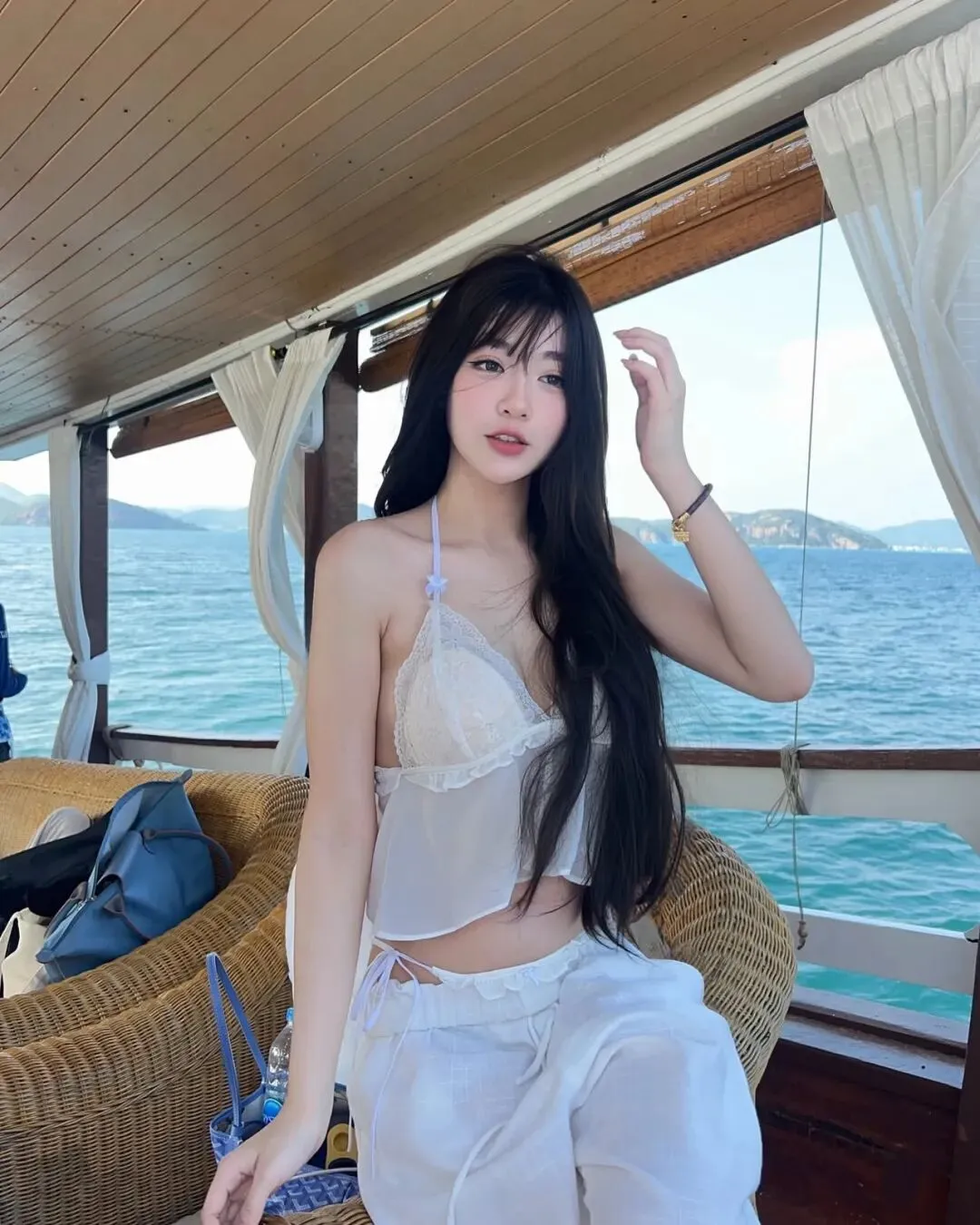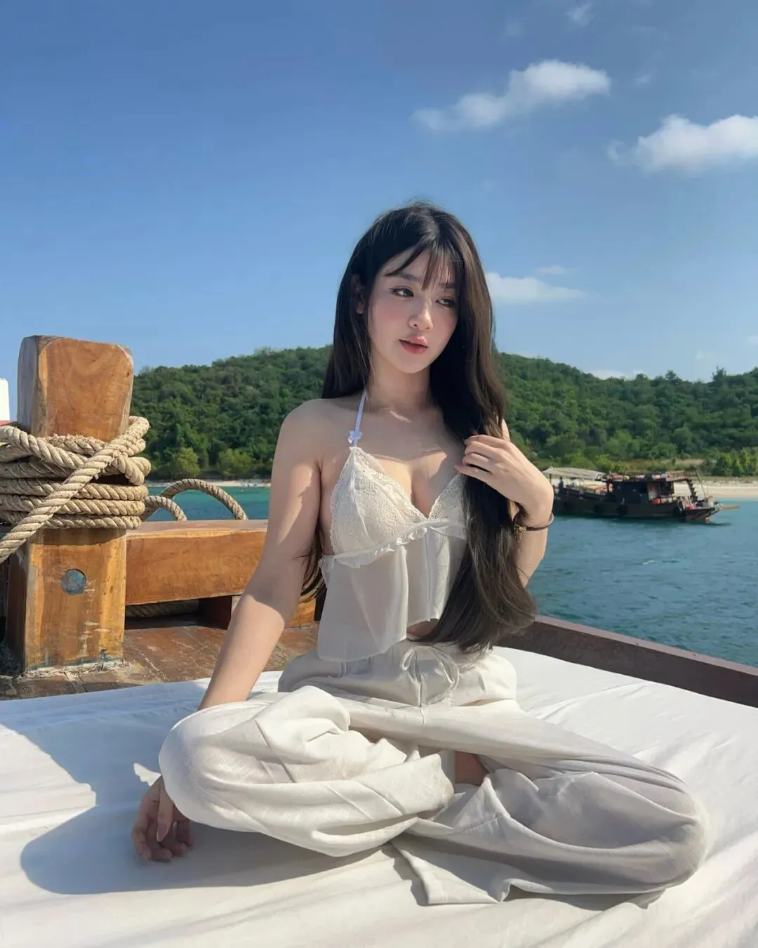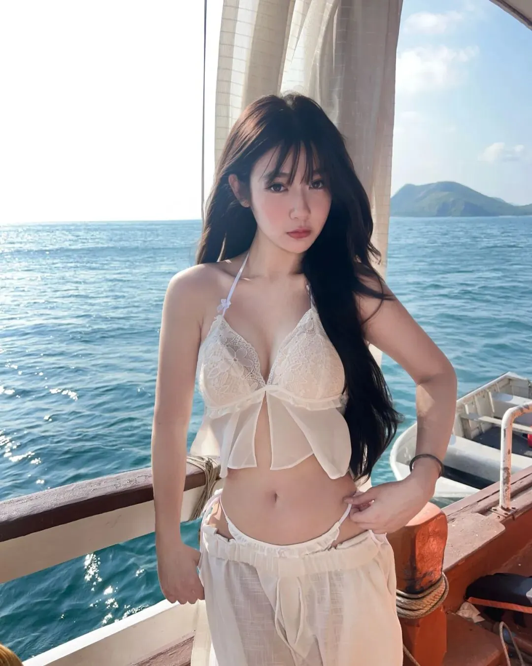 在海风温柔摩挲的午后,一抹纯净的白色无疑是与蔚蓝海洋最默契的对白。置身于缓缓破浪的游艇甲板上,选择一件带有细腻蕾丝钩花设计的白色短吊带,配合轻盈的同色系抽绳阔腿裤,这种材质上的虚实结合,既能在刺眼的阳光下折射出如瓷器般的柔光感,又能通过面料的透气度赋予身体最极致的松弛。拍照姿势上,无需刻意讨好快门,只需顺应船身的微微晃动,侧身坐在藤编座椅旁,任由长发在风中自然飞舞,指尖轻触下颌或随意搭在膝头,这种“被捕捉”的动态瞬间,往往比定式摆拍更能传递出旅途中的自在与骄傲。此时的光影是最高级的滤镜,它在那抹蕾丝边际留下错落的阴影,让每一个定格的瞬间都充满了如同度假大片般的叙事厚度。这种穿搭记录的不仅是衣着的调性,更是一份在广袤水域间寻觅内心平衡的定力,穿透了数字图像的冷硬,绽放出最为真实且富有呼吸感的生命华彩。