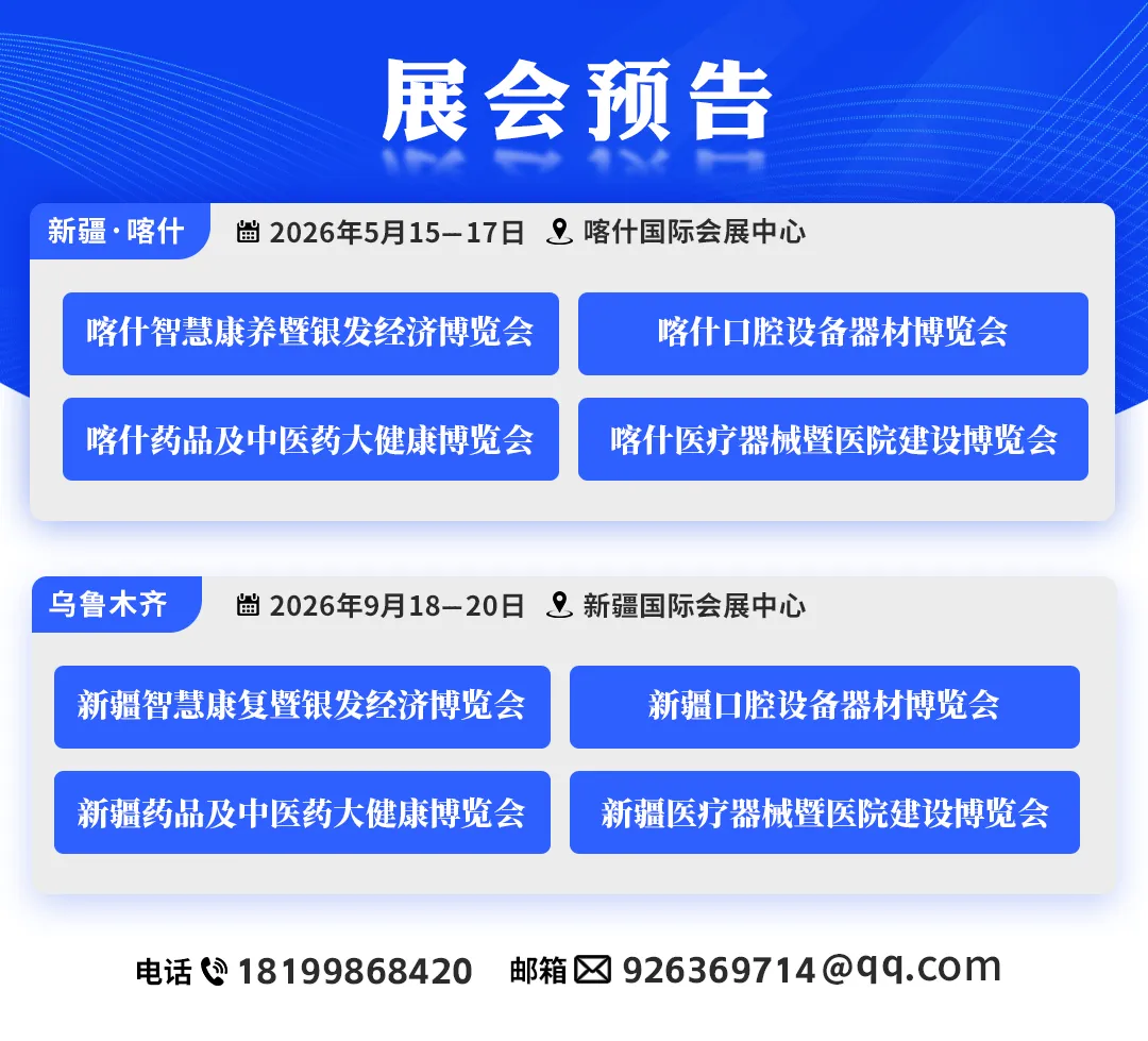 2026年5月15-17日,"喀什医疗器械暨医院建设博览会"、"喀什药品及中医药大健康博览会"、“喀什智慧康养暨银发经济博览会”、“喀什口腔设备器材博览会”将在新疆喀什国际会展中心盛大举办!