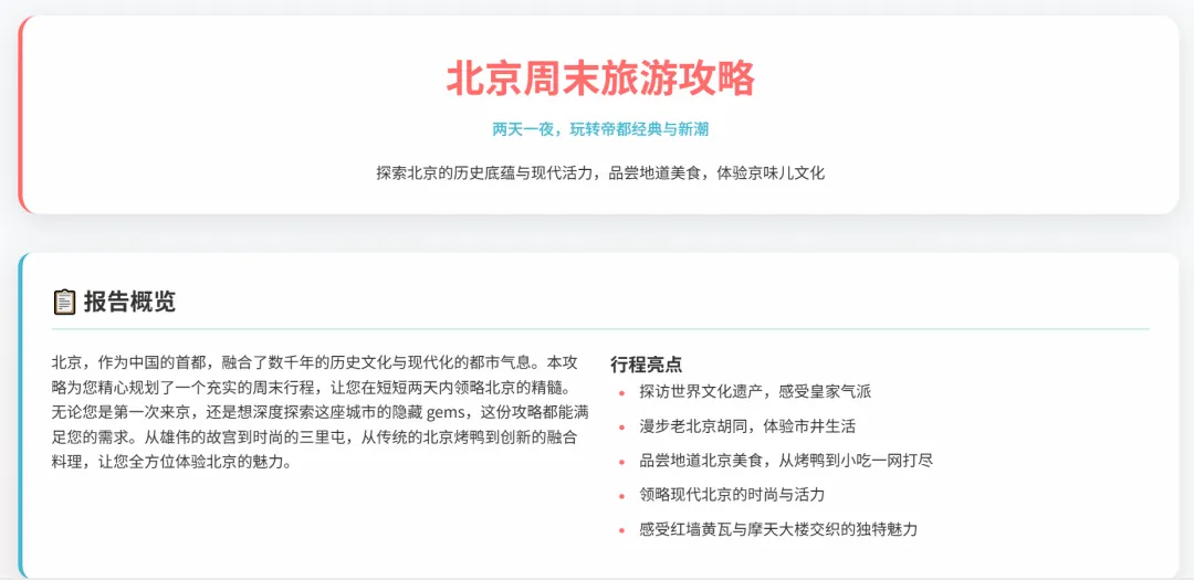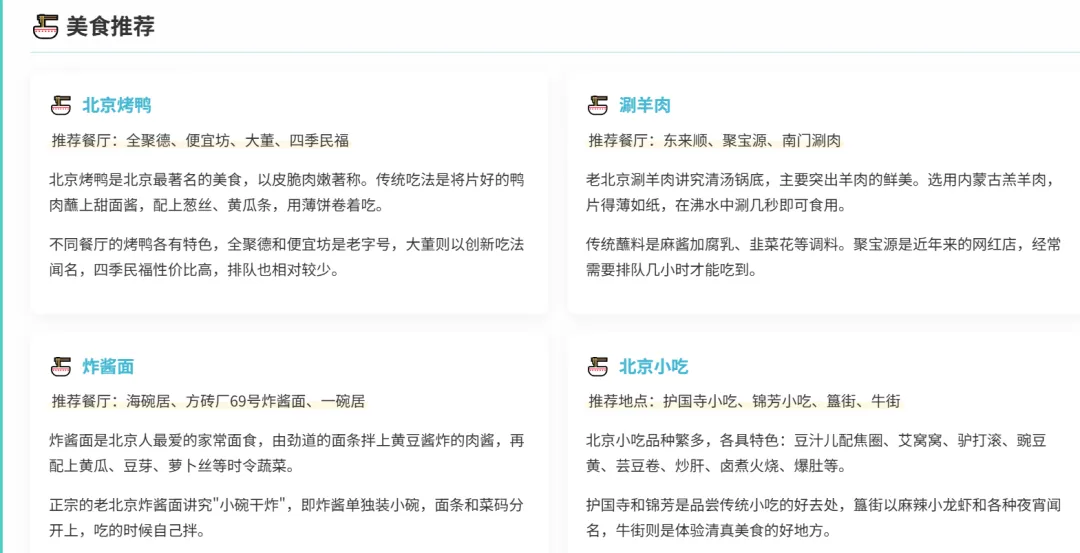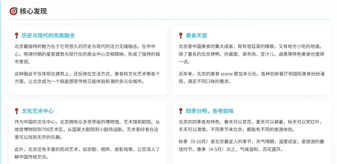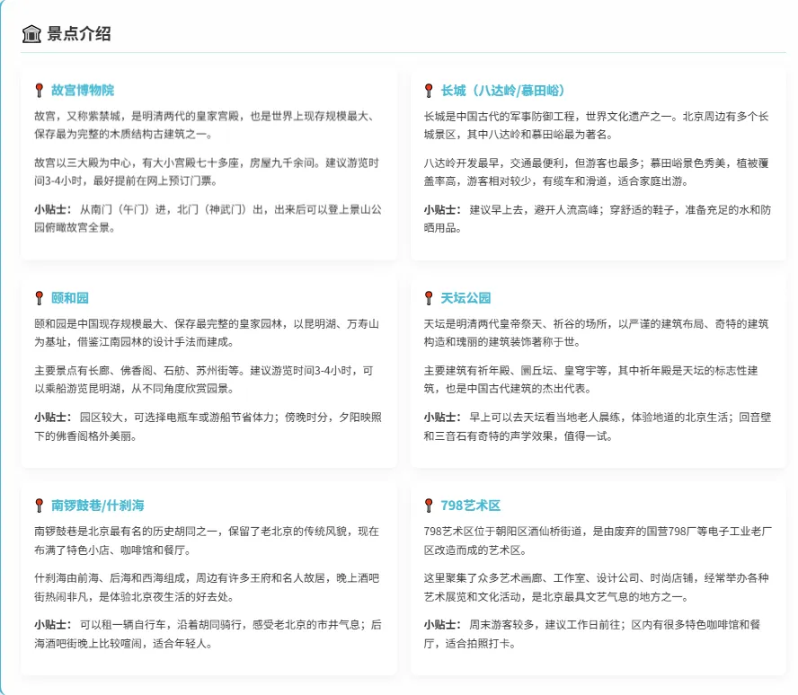 这部分是我最佩服的地方。AI没有急于罗列景点,而是先做了一个宏观分析,总结了北京的四大核心特质。