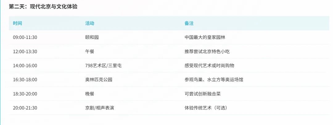 第二天(现代与艺术):它将颐和园与798/三里屯结合。这种行程设计考虑到了地理位置,也充分考虑了游客的不同兴趣。无论是文艺青年还是时尚潮人,都能找到自己的归宿。