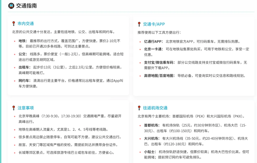 这部分是攻略里实用主义的典范。因为大家都知道北京的交通是游客的一大痛点,因此AI专门提供了详细的解决方案。