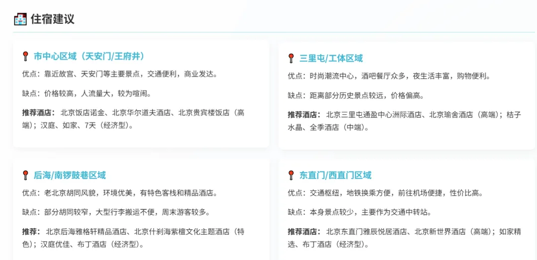攻略的住宿部分也非常专业。AI将住宿区域分成了市中心、三里屯、后海和交通枢纽等板块。