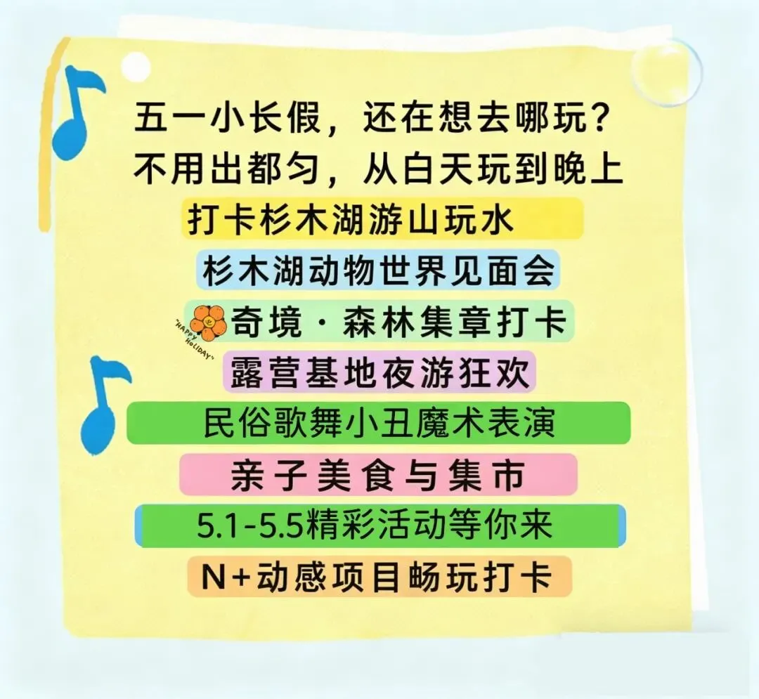 超有趣的杉木湖萌宠运动会来啦!五一期间:每天下午13:30-16:00,在开阔区域准时开启“套鸭子”趣味竞赛,可以和孩子一起打卡套圈活动,体验套圈的快乐~